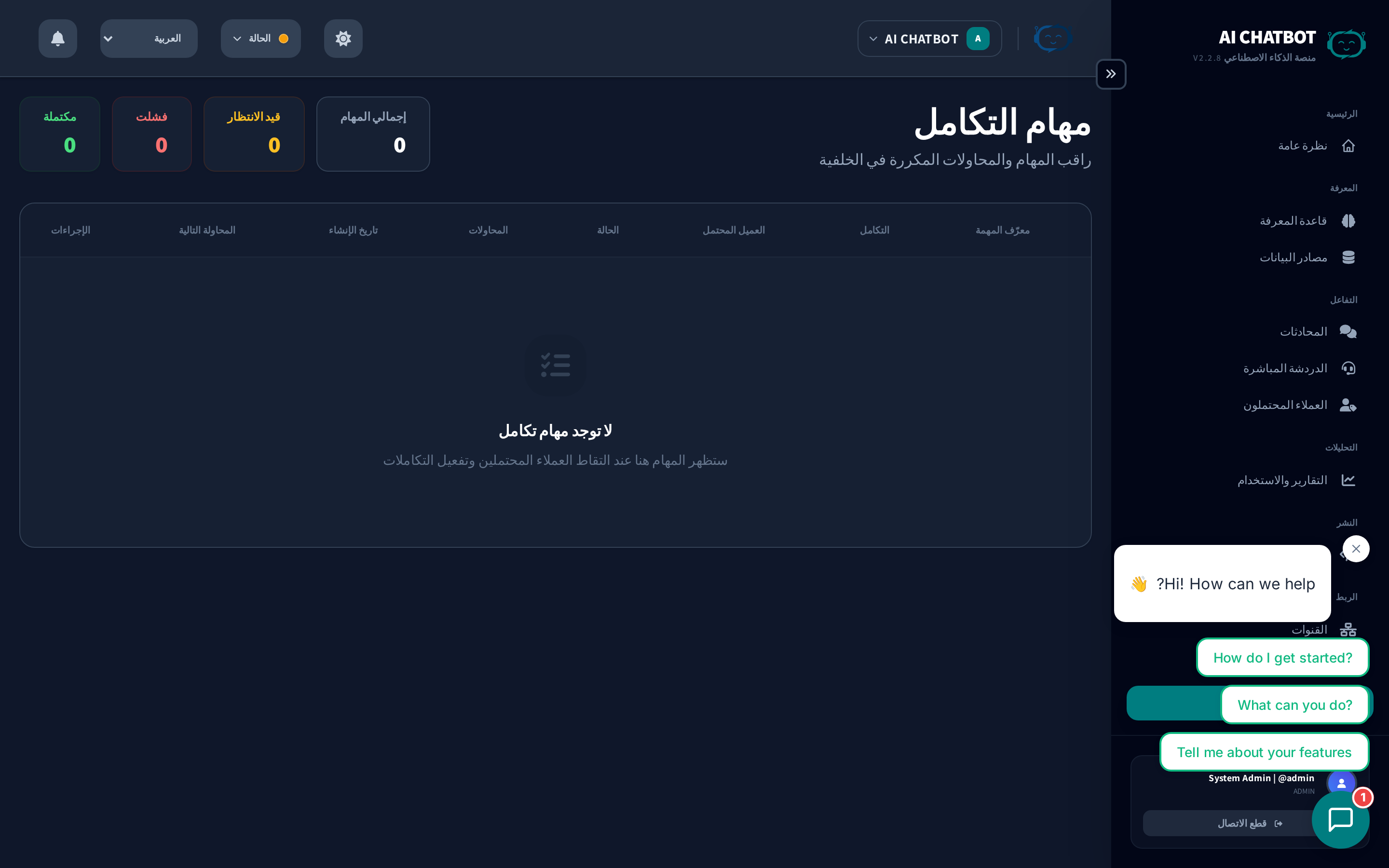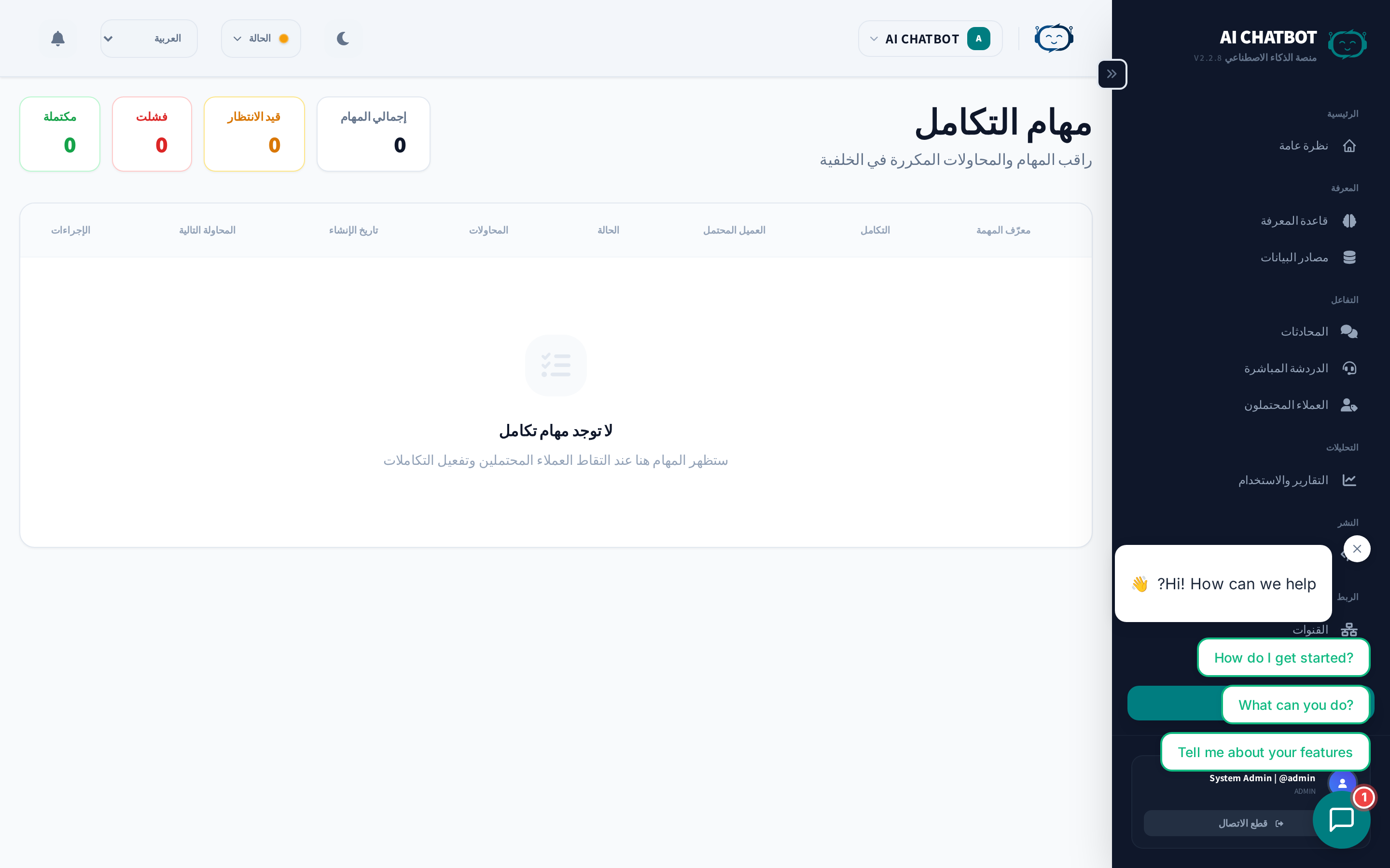 - راقب بعد التغييرات الجماعية — بعد رفع العديد من الملفات أو تحديث قاعدة المعرفة، تحقق من "مهام المزامنة" للتأكد من اكتمال كل شيء بنجاح قبل اختبار البوت.