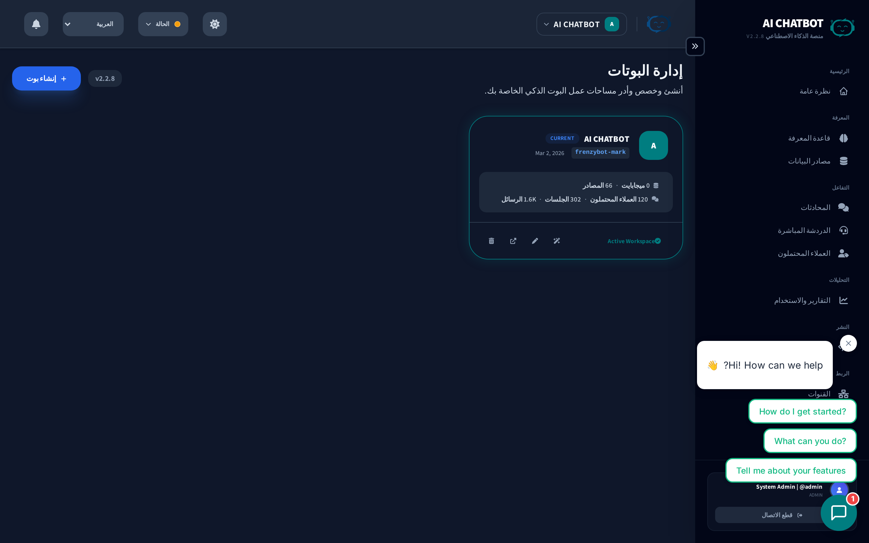 - إحصائيات لكل بوت: الملفات، الرسائل، الجلسات، العملاء المحتملون، والجلسات النشطة.