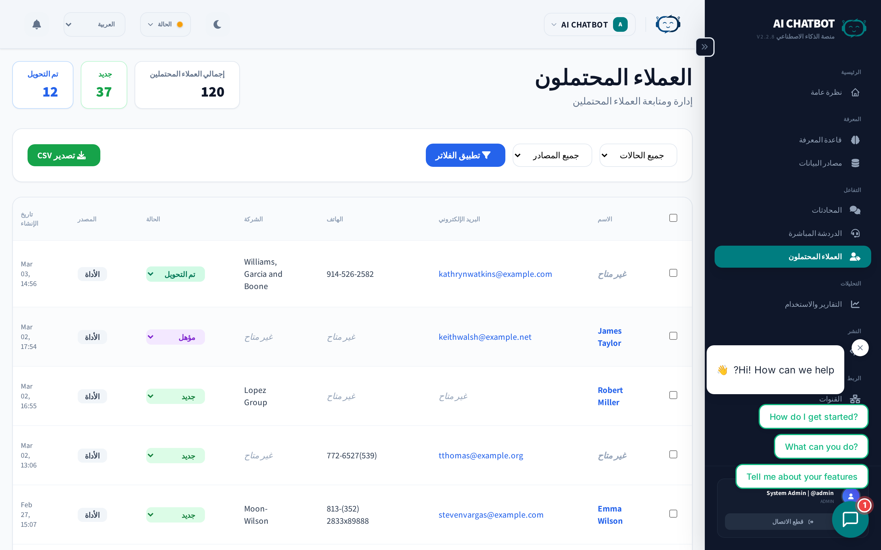 تعد إدارة العملاء المحتملين بمثابة عرض لمسار المبيعات الخاص بك لكل جهة اتصال يتم التقاطها بواسطة البوت. يتضمن كل عميل محتمل سياق المحادثة، وتفاصيل الاتصال، ومعلومات المصدر حتى يتمكن فريقك من المتابعة بسرعة وذكاء.