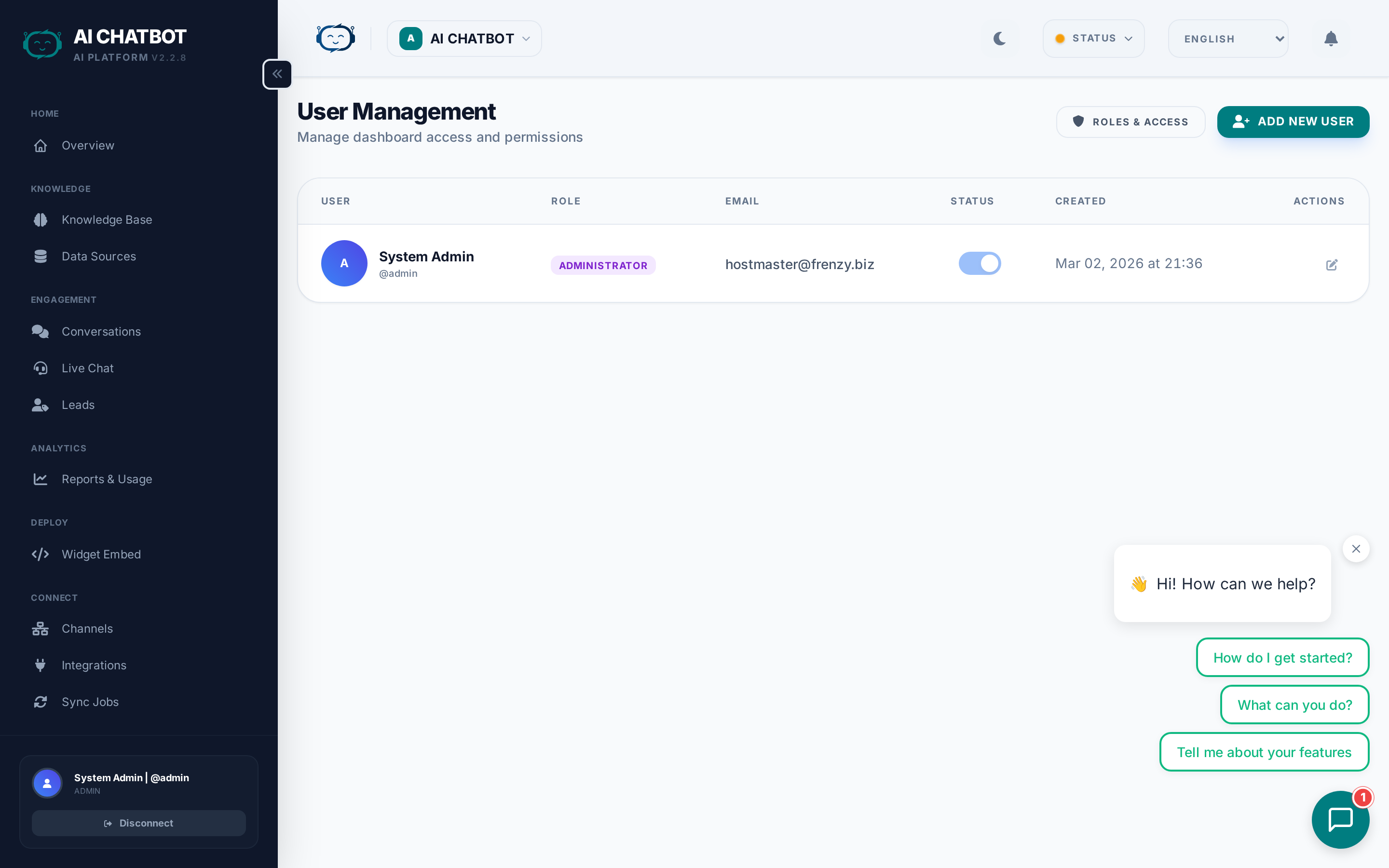 | Staff | Daily operational modules only — Knowledge Base, Conversations, Leads, Integrations, Channels, Sync Jobs | Support agents, content managers |