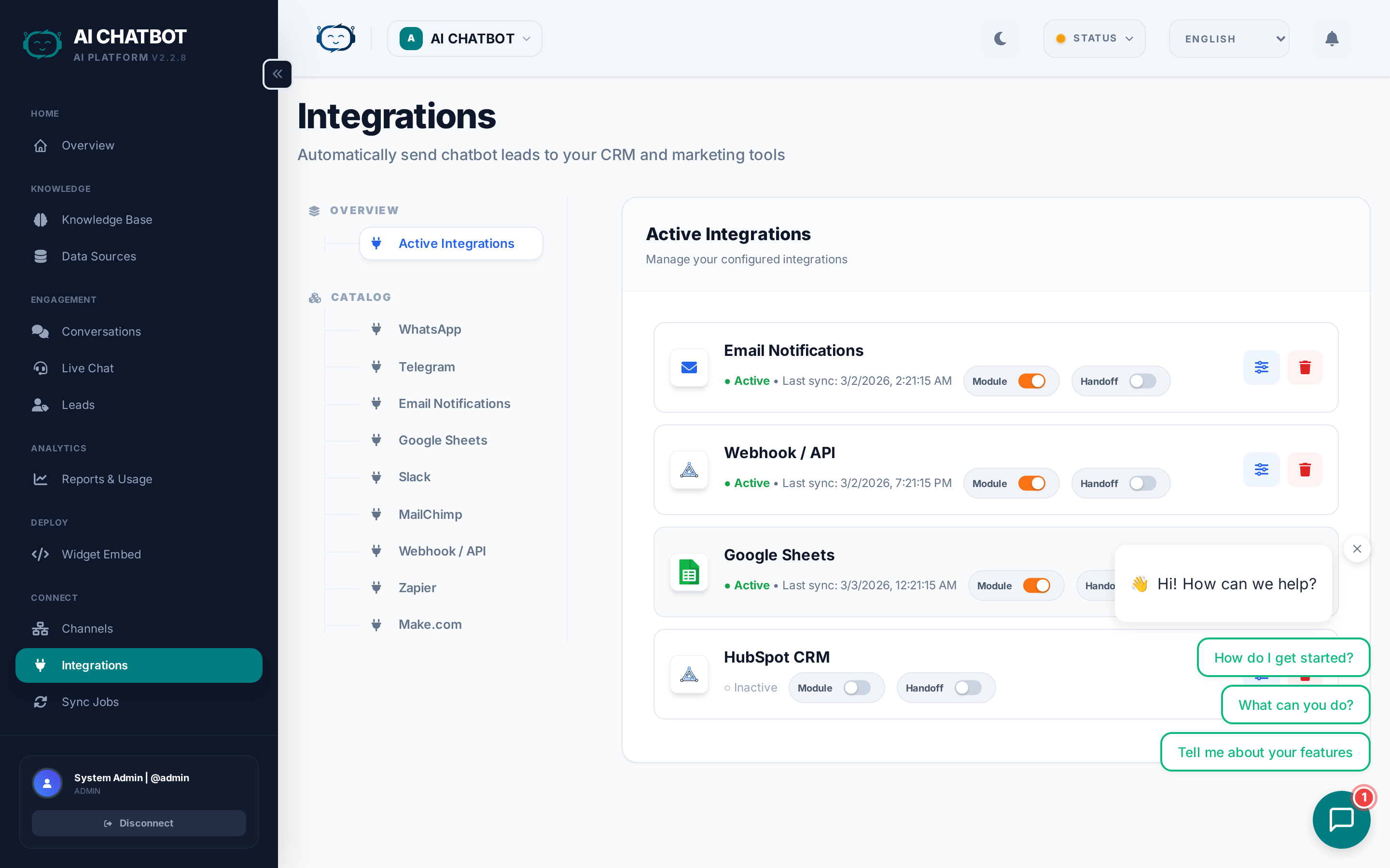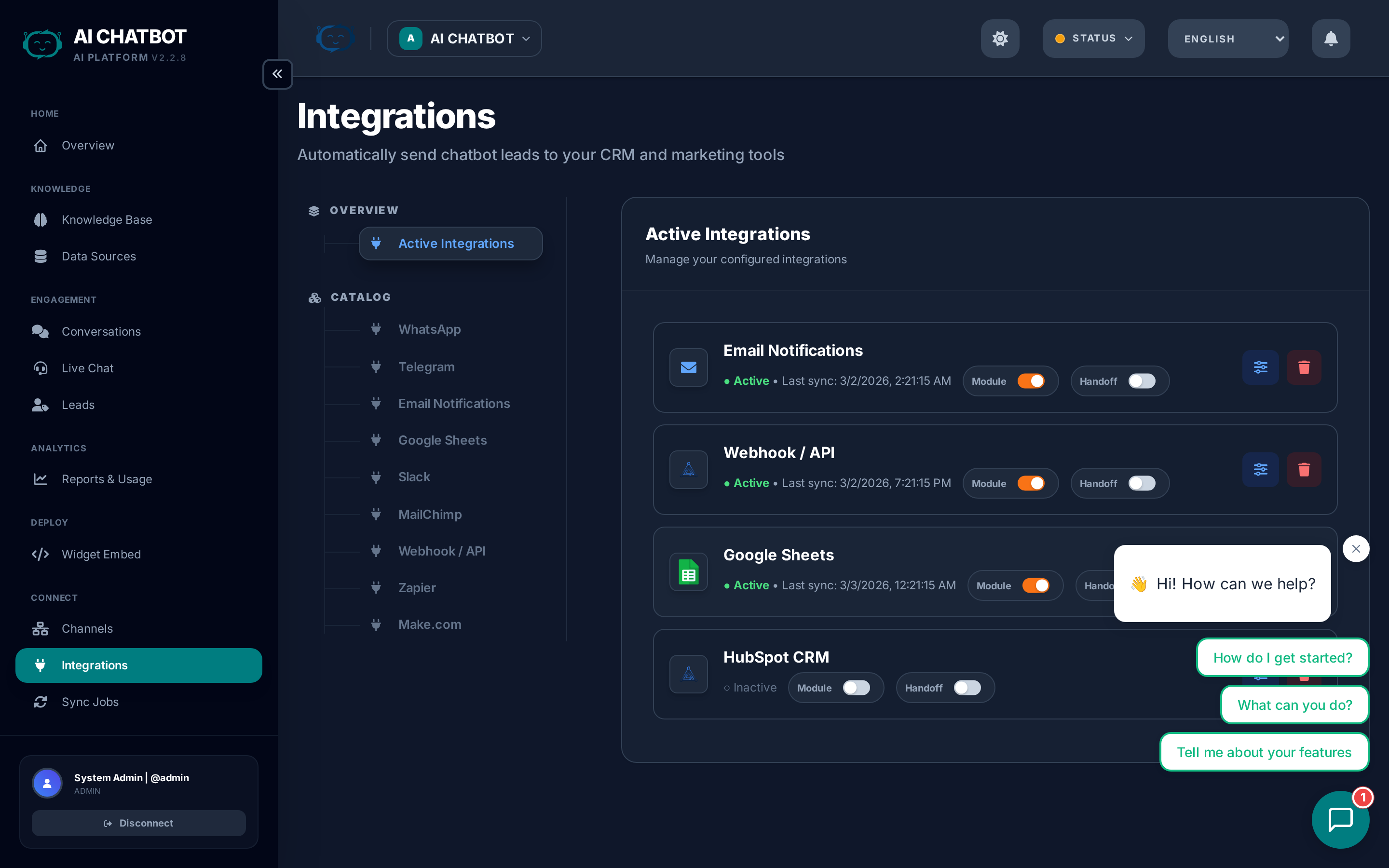 Integrations automatically send leads, alerts, and conversation data to the tools your team already uses — so no one has to copy/paste data from the dashboard.