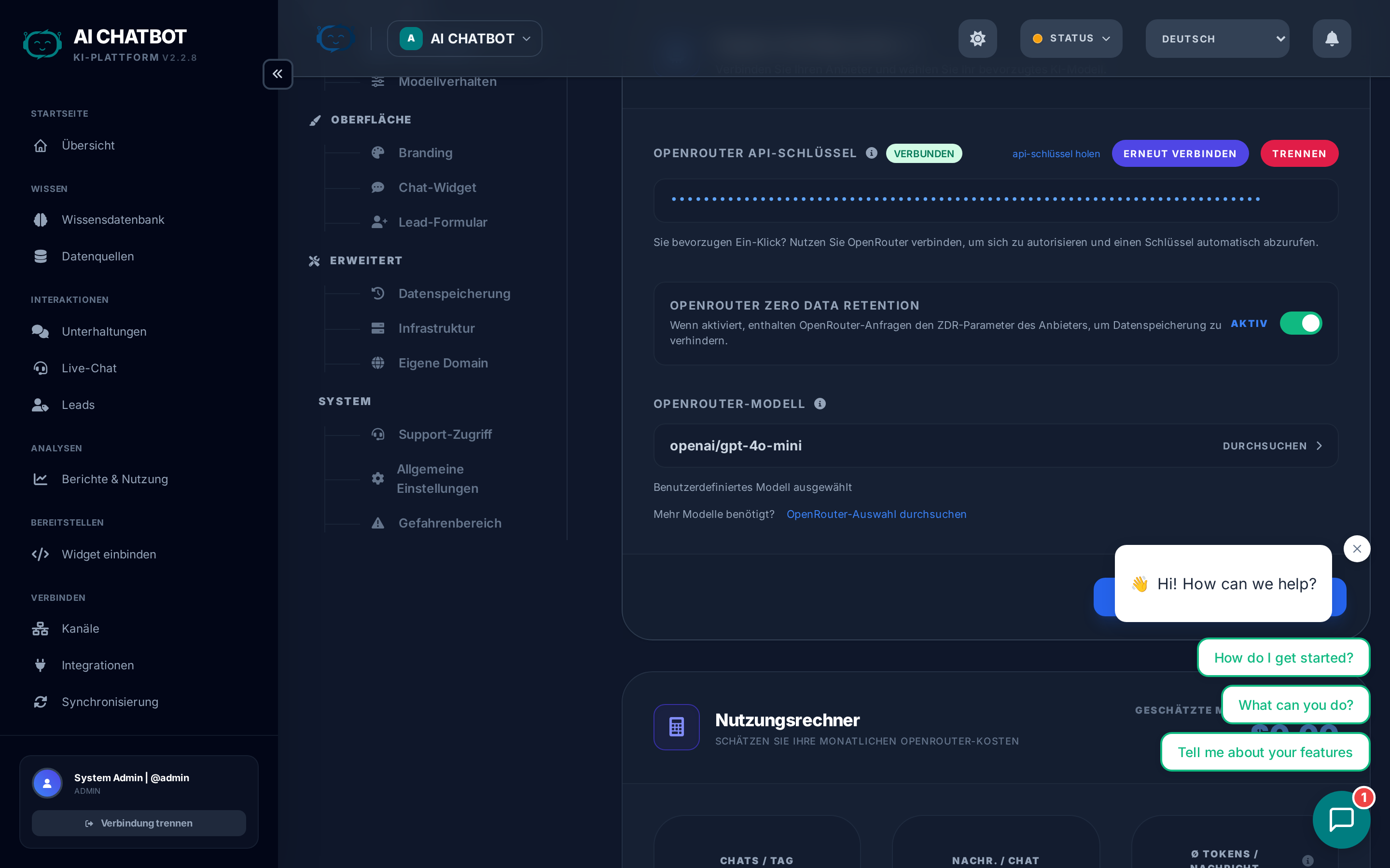 | Connect OpenRouter | Verknüpfen Sie Ihr OpenRouter-Konto über sicheres OAuth | Klicken Sie auf die Schaltfläche, autorisieren Sie im Popup, fertig |