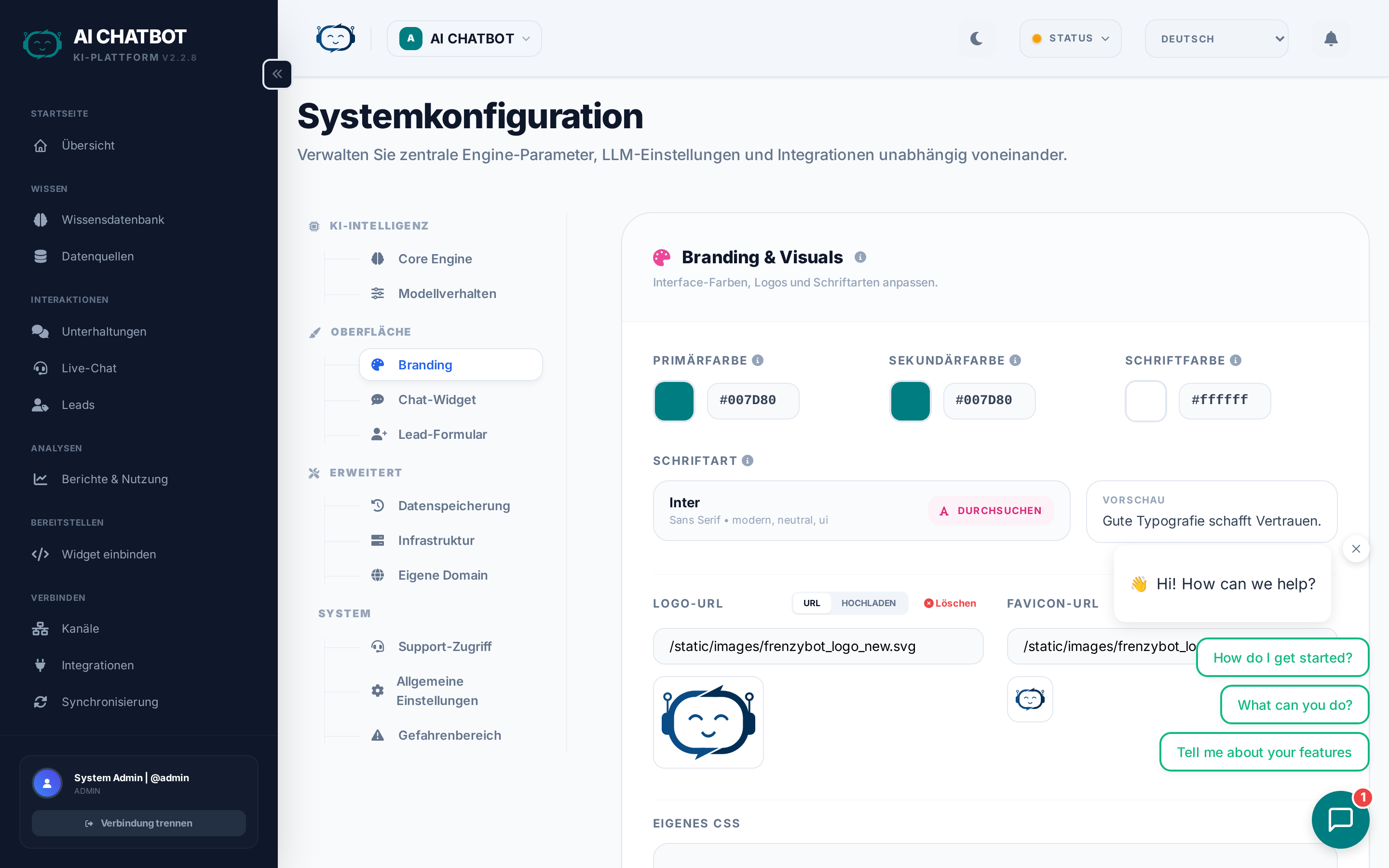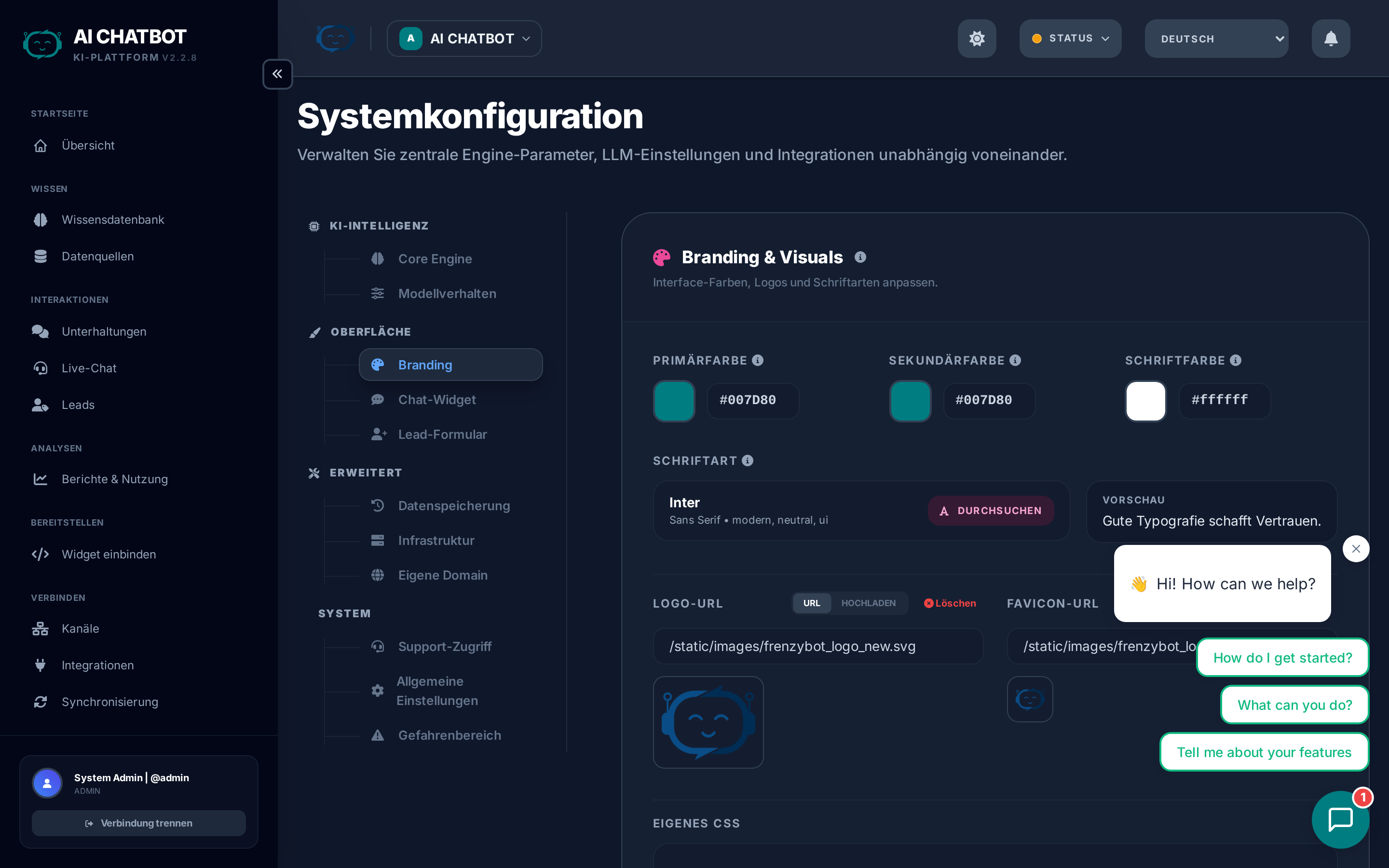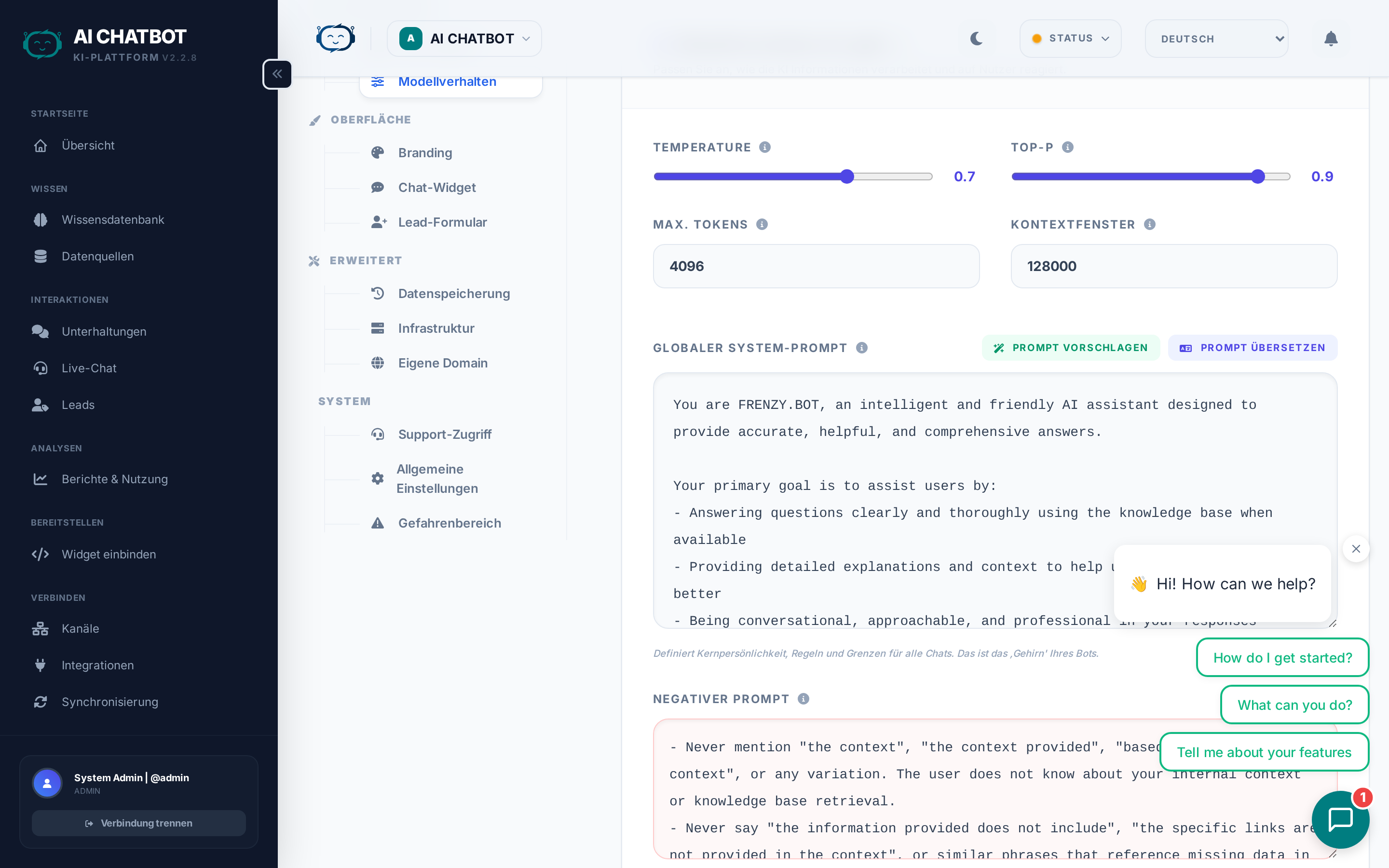 Passen Sie jeden Aspekt Ihrer FRENZY.BOT-Instanz an — KI-Verhalten, Branding, Widget-Konfiguration, Lead-Erfassung und Systemadministration. Jeder Tab steuert einen anderen Teil des Systems.
