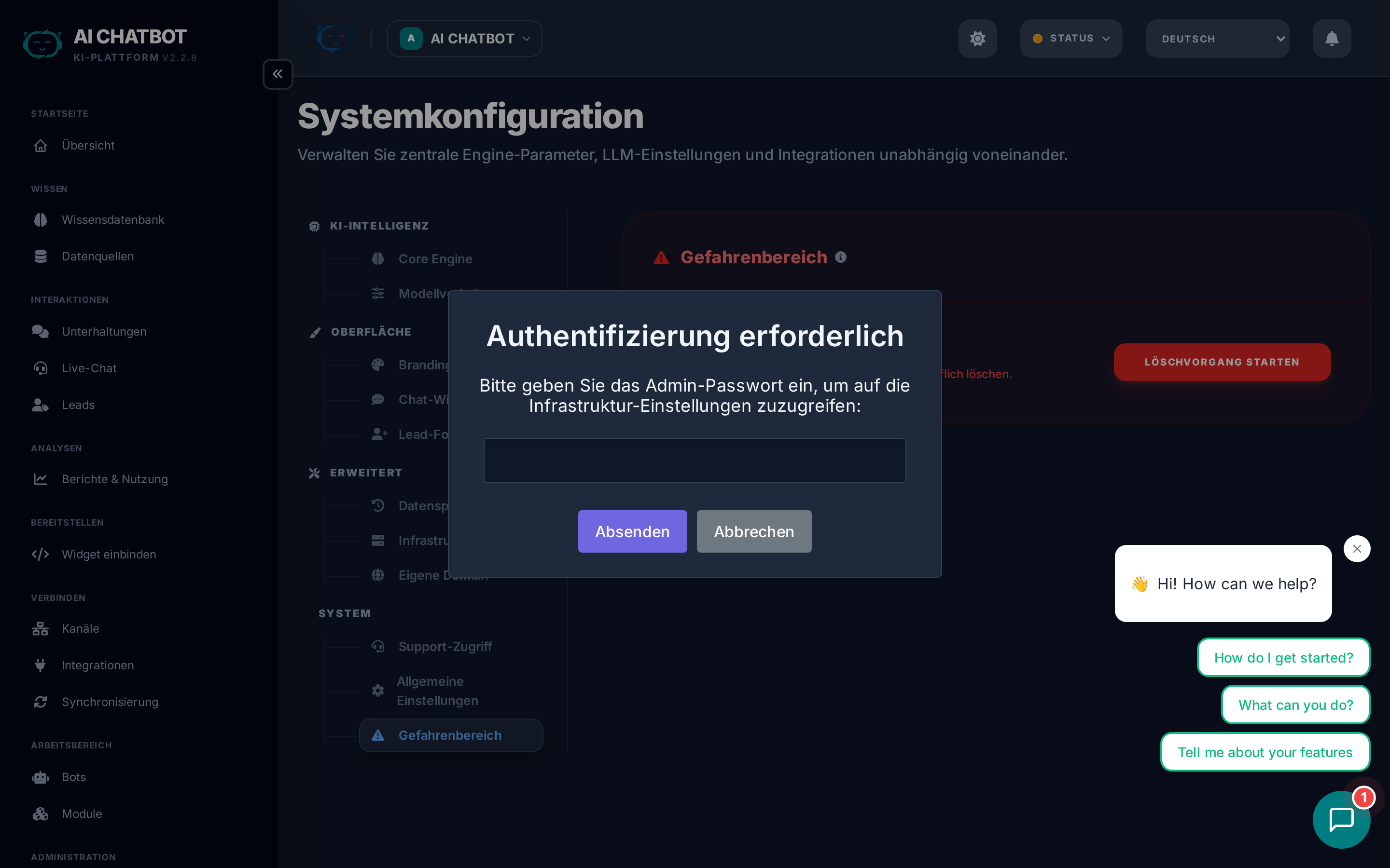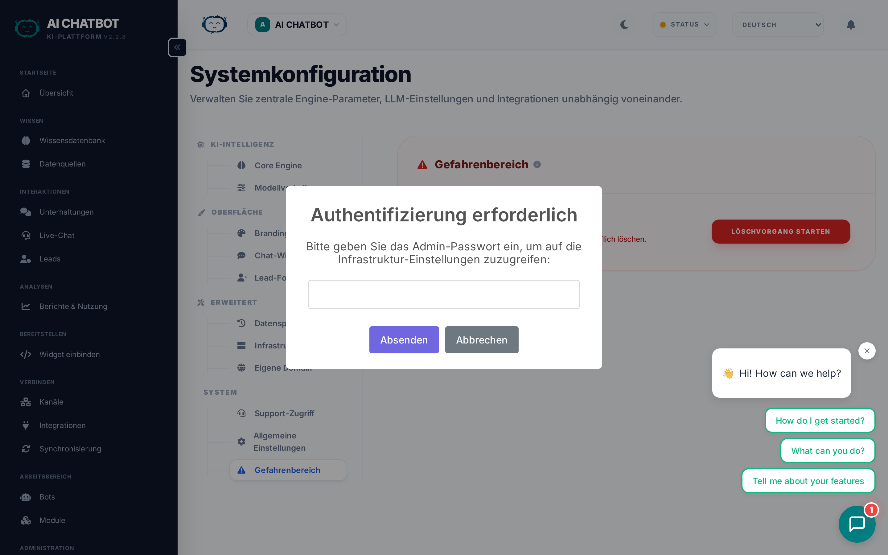 | Factory Reset | Löscht alle indizierten Inhalte, Chats, Leads und Analytics | Bot-Konfig (Einstellungen, Branding, User) |