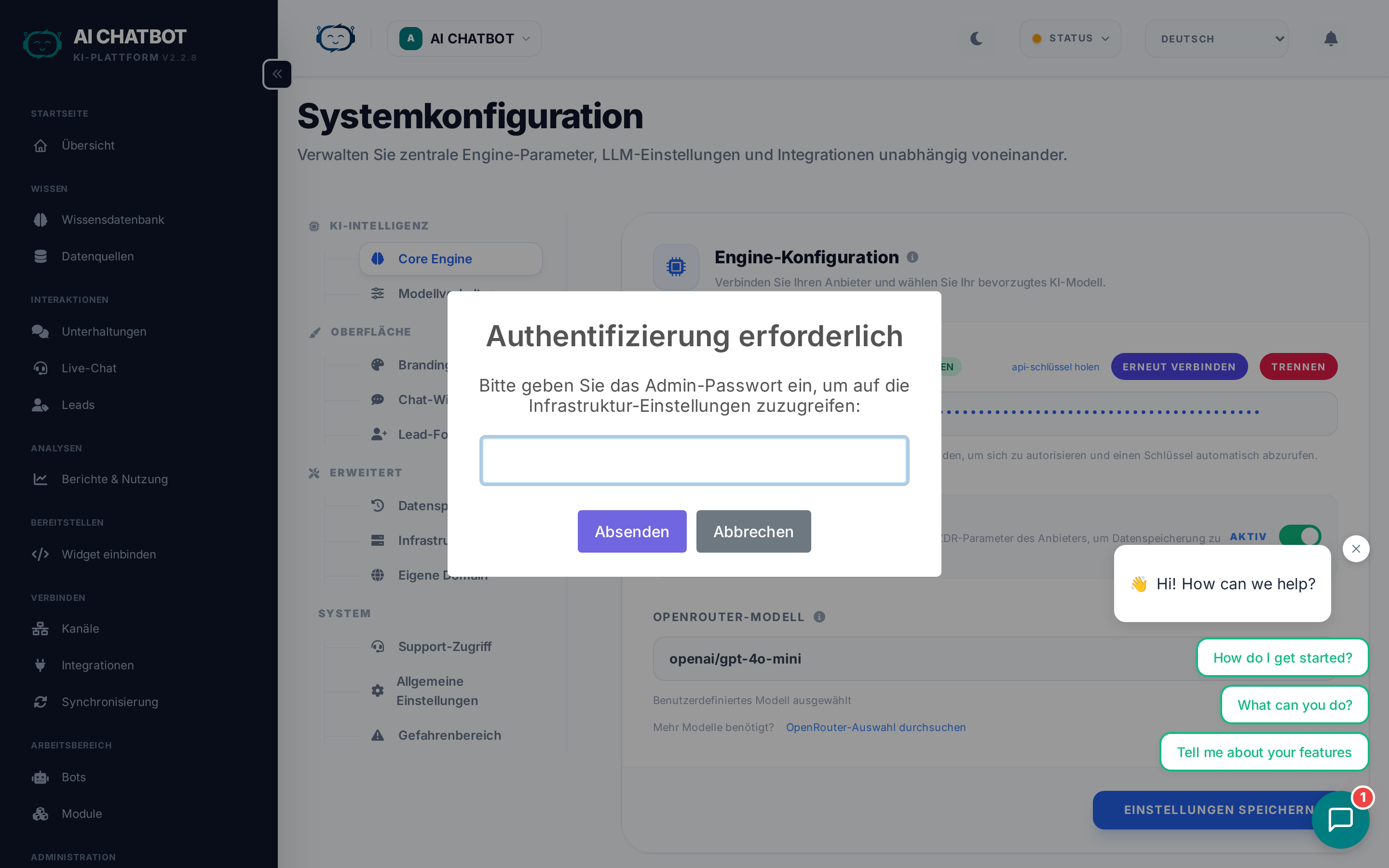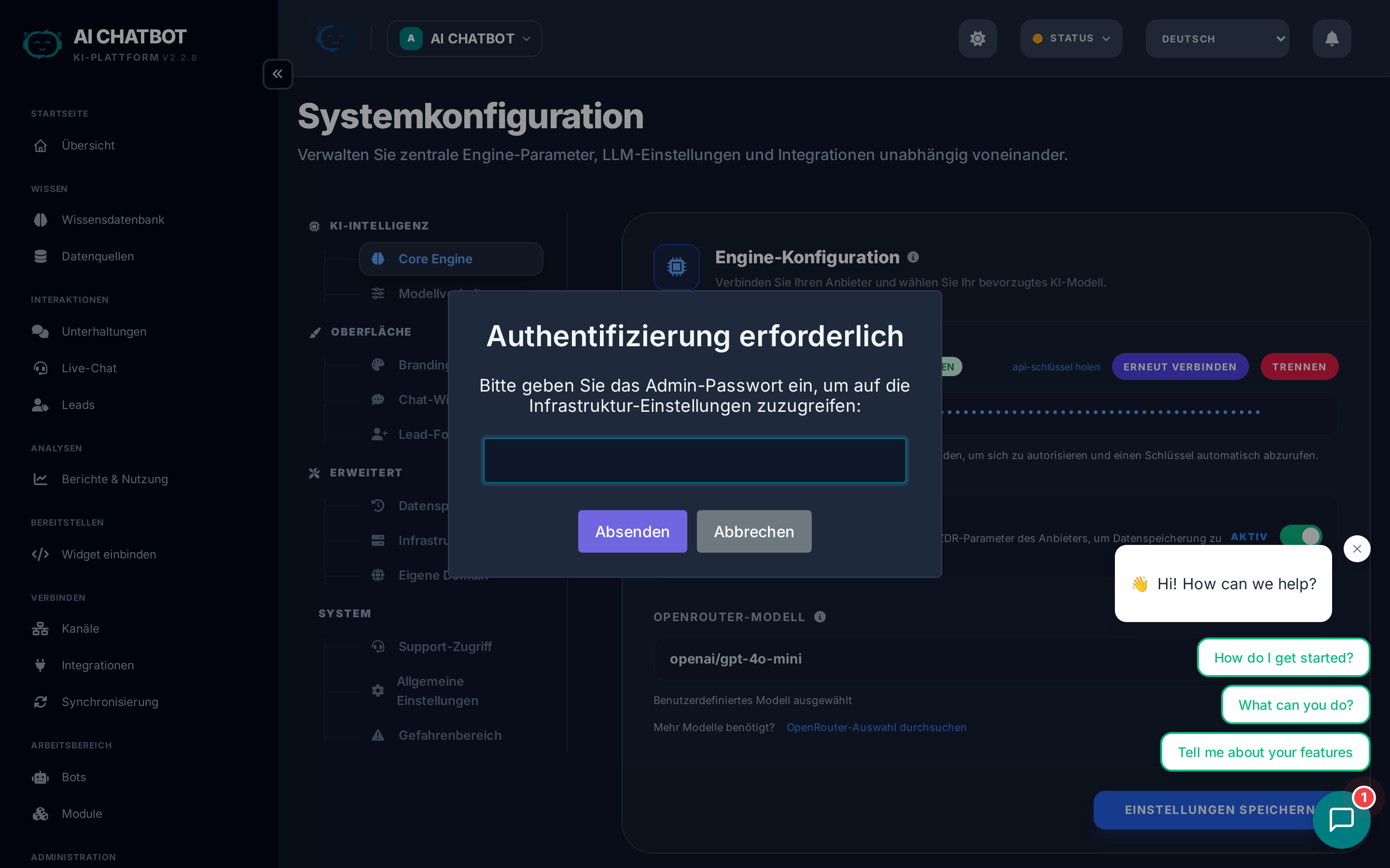 | LLM | Grün | Verbindung zum KI-Anbieter und API-Key-Gültigkeit | KI-Engine Tab prüfen → OpenRouter neu verbinden |