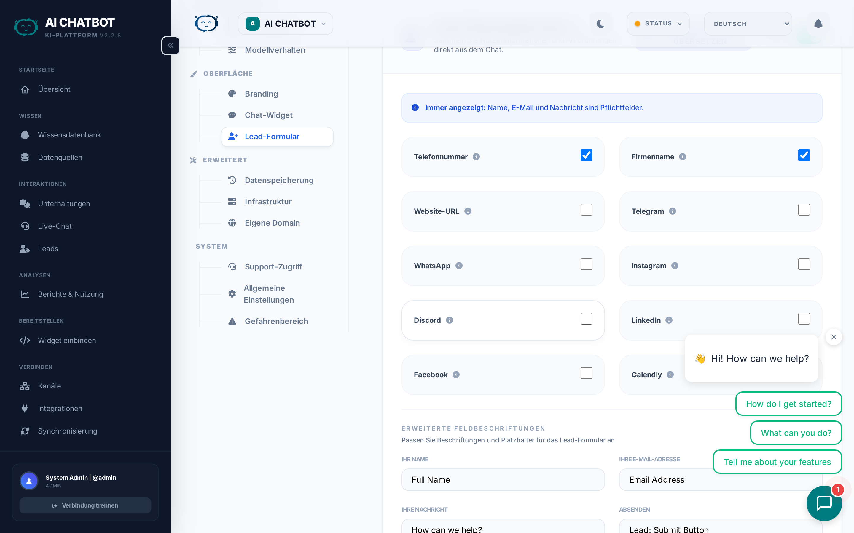 Steuern Sie, welche Felder erfasst werden, wenn ein Lead im Chat generiert wird. Das Formular erscheint im Widget, wenn die Absichtserkennung oder Konfigurationsregeln greifen.