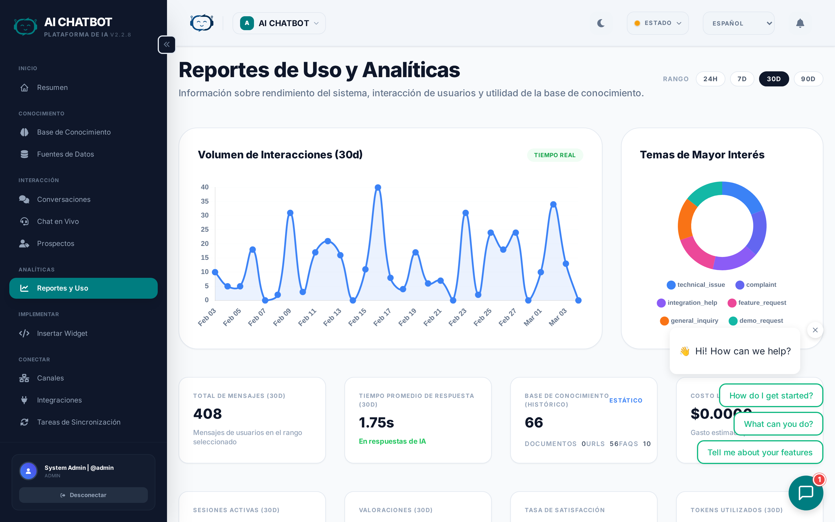 - Volumen de interacción: Un gráfico de líneas en tiempo real que muestra las tendencias de mensajes y sesiones a lo largo del tiempo.