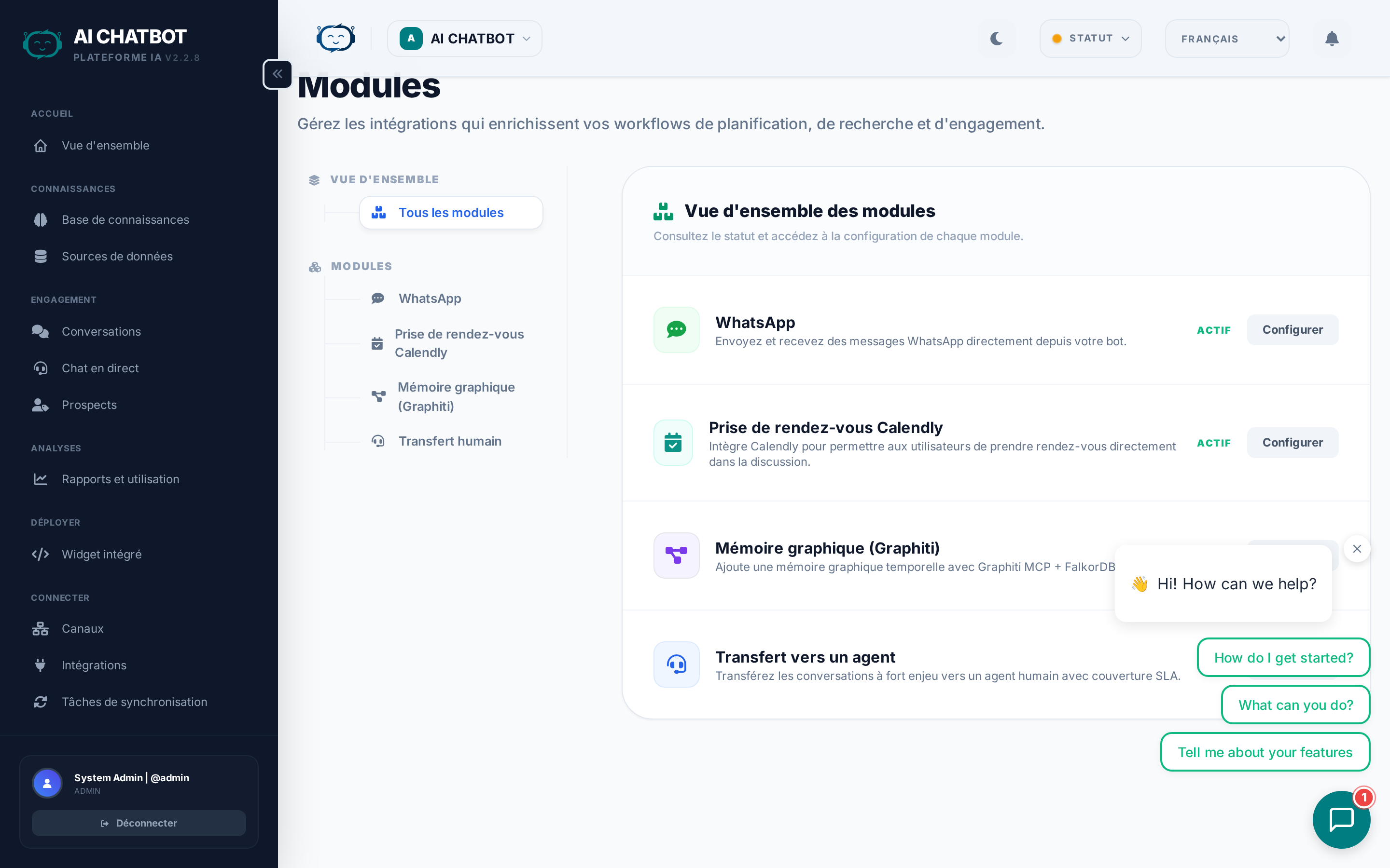 WhatsApp, Telegram et les autres plateformes de messagerie sont désormais gérés dans la page Canaux, et non dans les Modules.