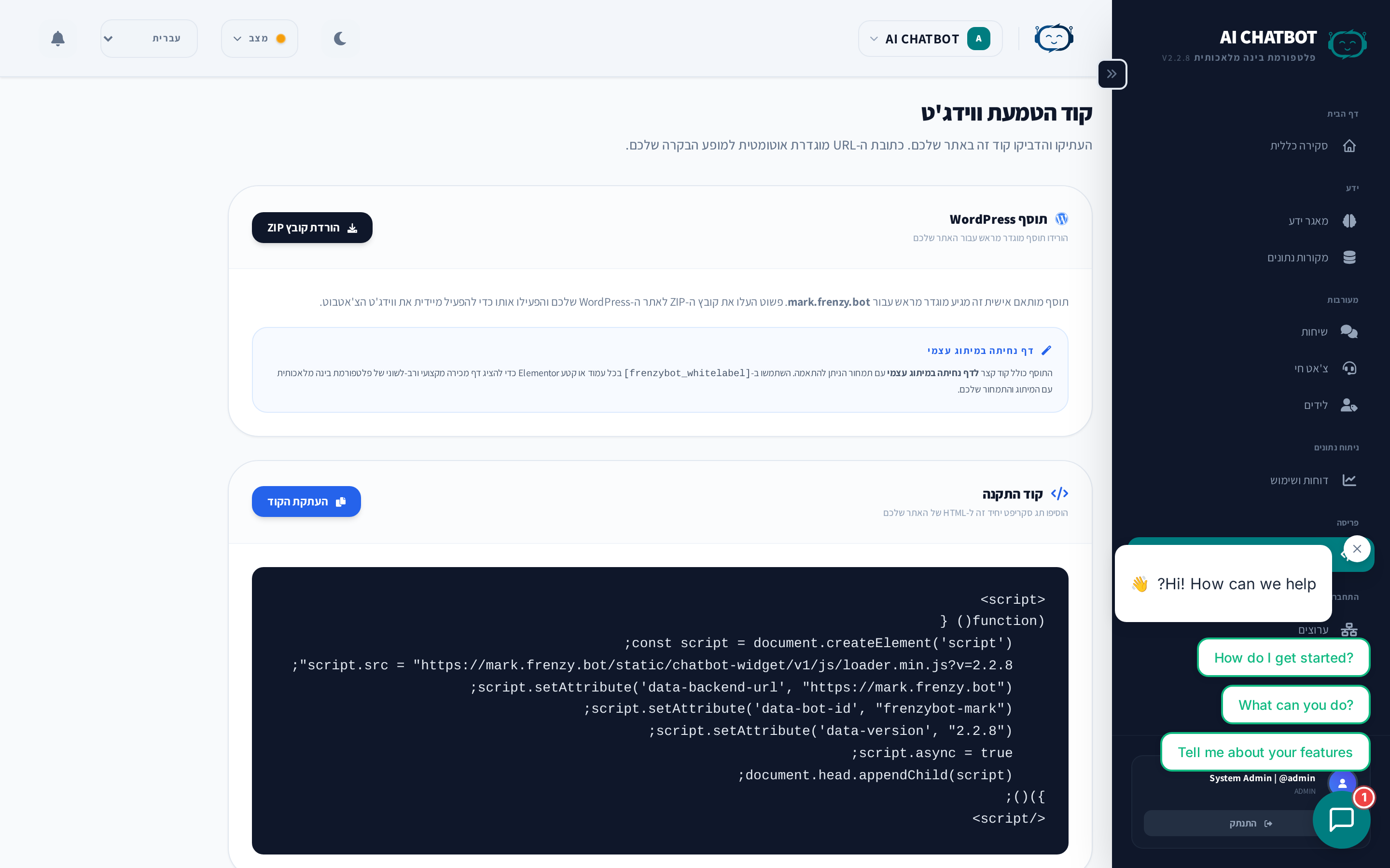 - מזהה הבוט מוצג בקוד ההטמעה ובדף ניהול הבוטים.