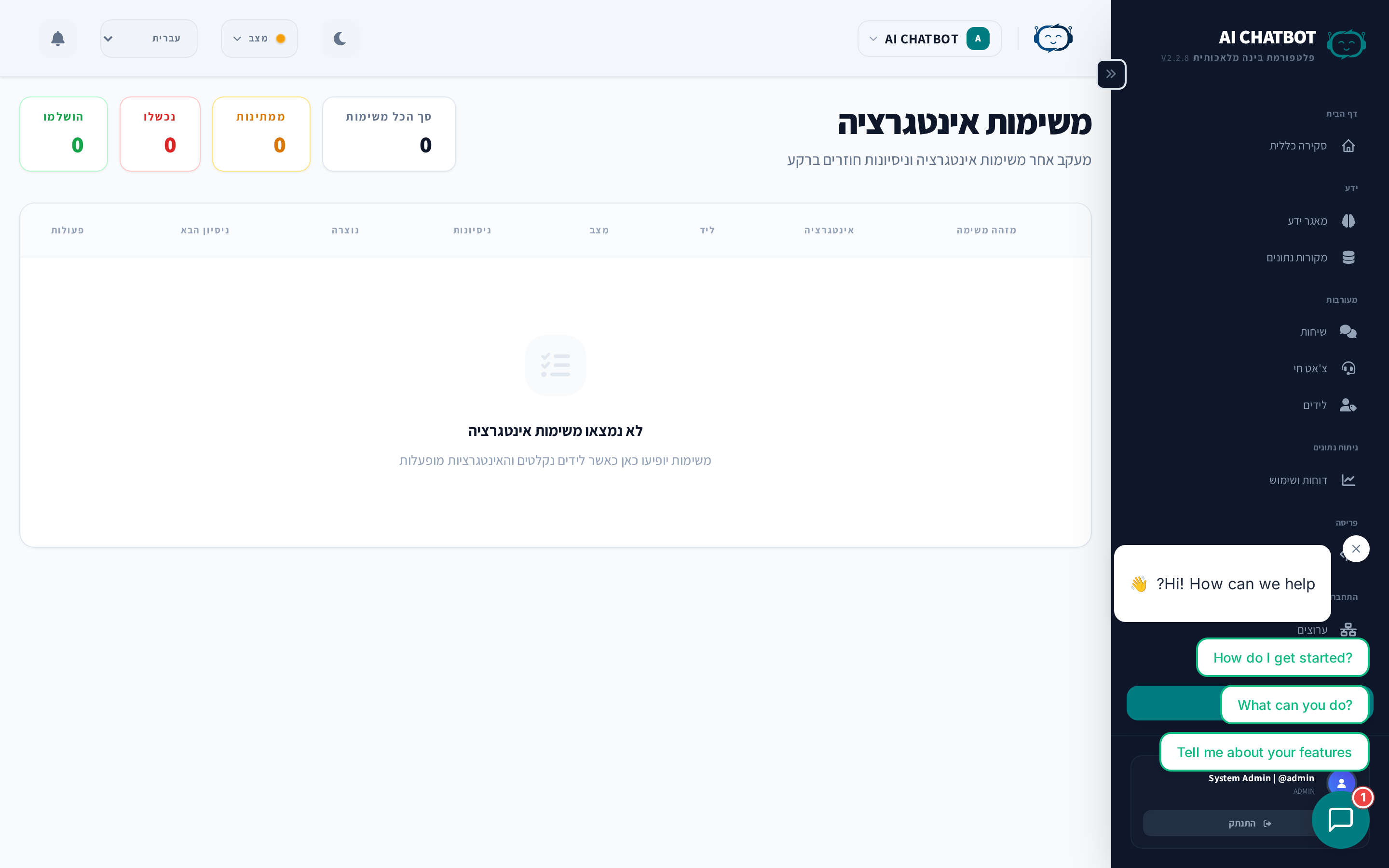 עבודות הסנכרון עוקבות אחרי כל משימת רקע שמעדכנת את בסיס הידע שלך — העלאות קבצים, סריקת URLים, ואינדקס של שאלות נפוצות. תשתמש בדף הזה כדי לעקוב אחרי התקדמות, לזהות כשלים, ולנסות שוב עבודות בעייתיות.
