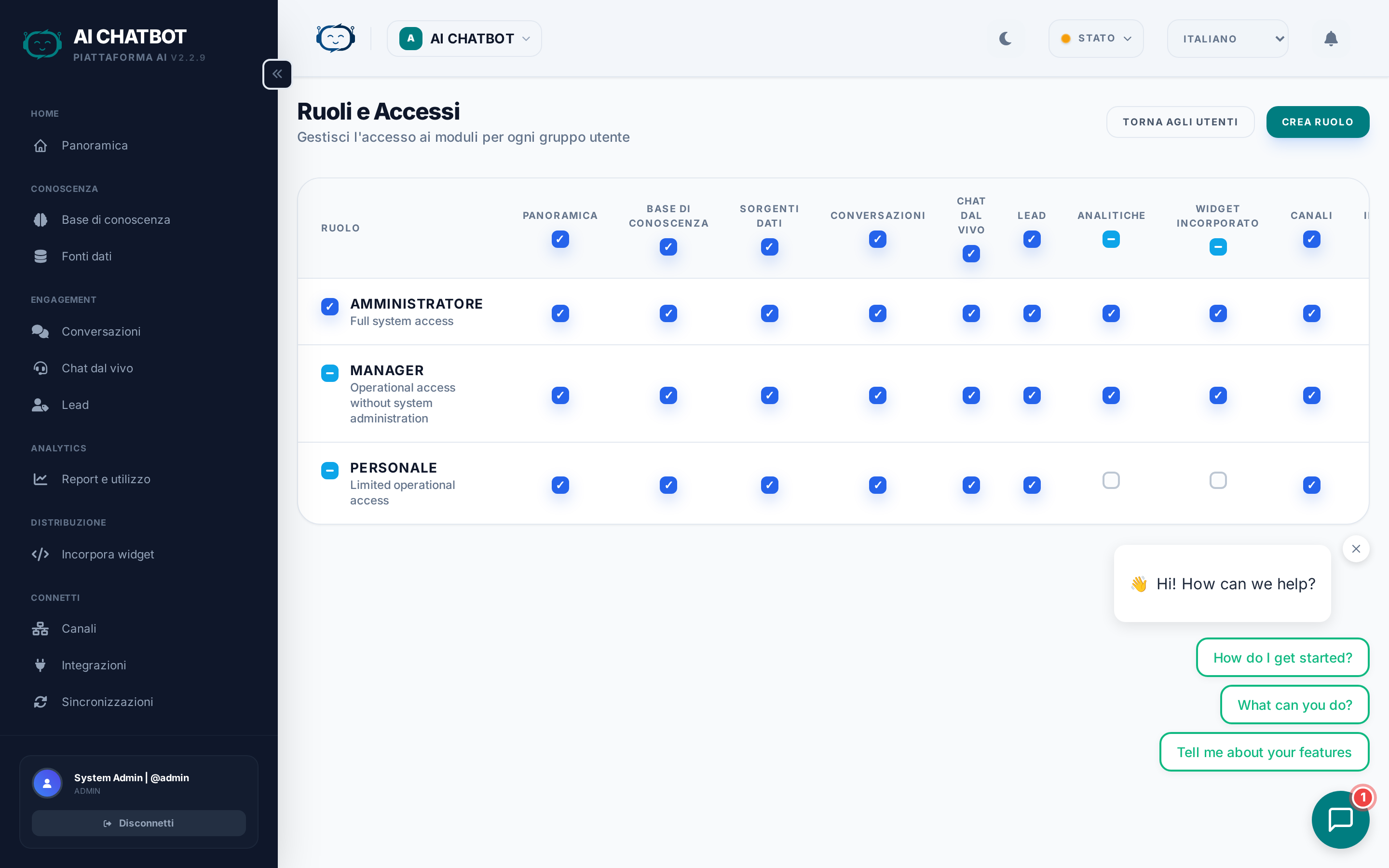 | Staff | Knowledge Base, Conversazioni, Lead, Integrazioni, Canali, Sync Jobs | Impostazioni, Utenti, Ruoli, Analytics, Log di Sistema, Moduli, Embed |