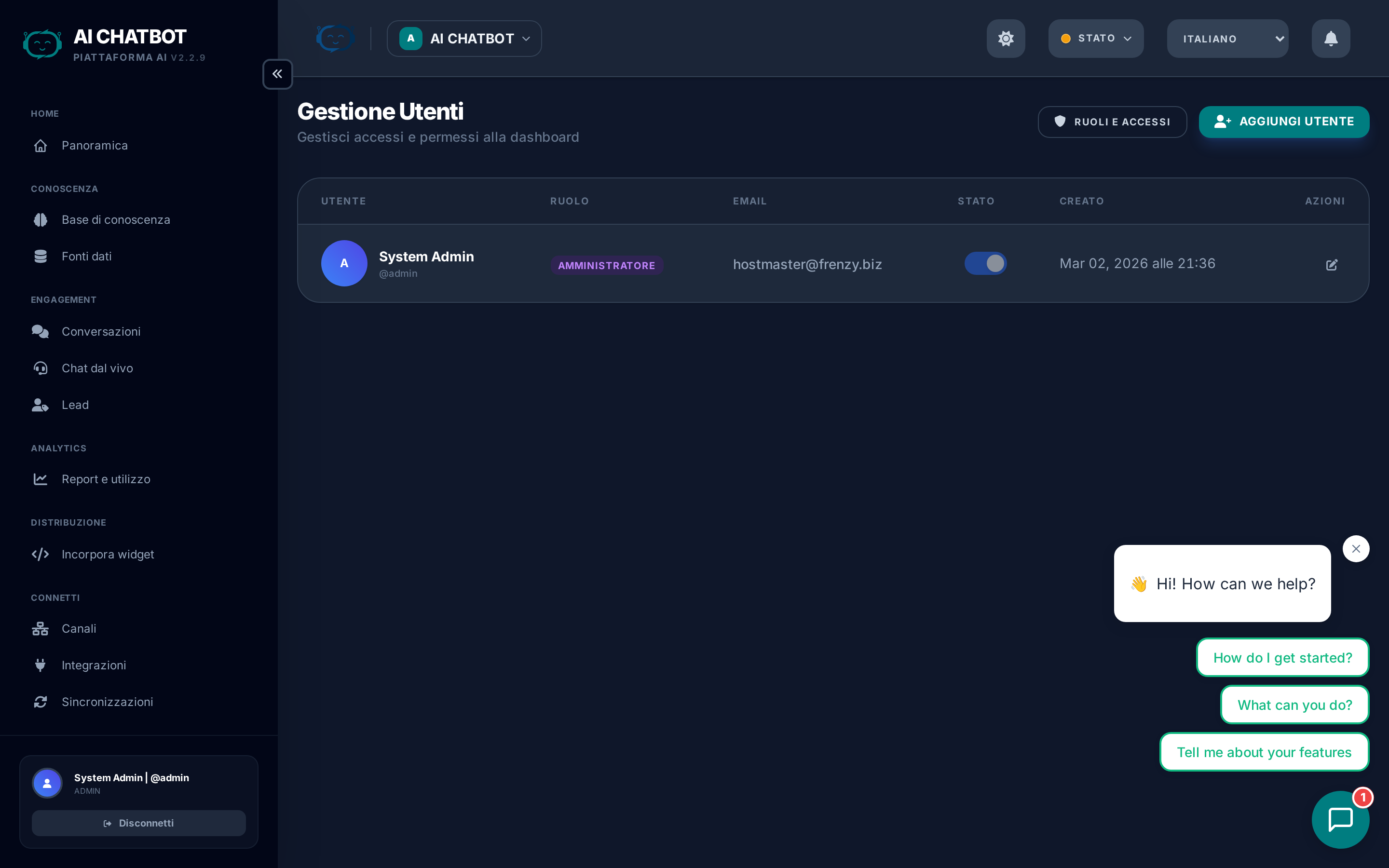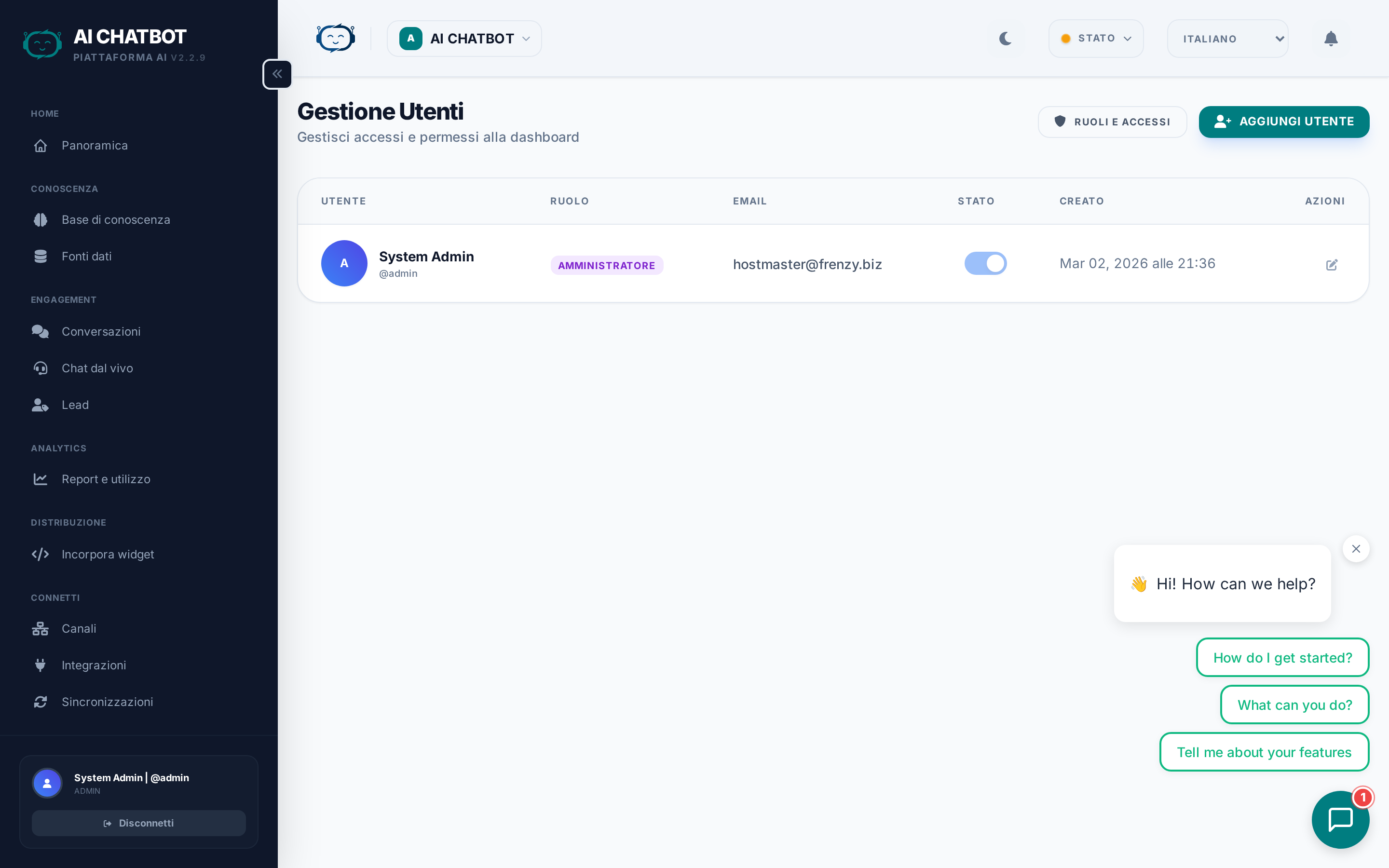 | Staff | Solo moduli operativi quotidiani — Knowledge Base, Conversazioni, Leads, Integrazioni, Canali, Sync Jobs | Agenti di supporto, content manager |