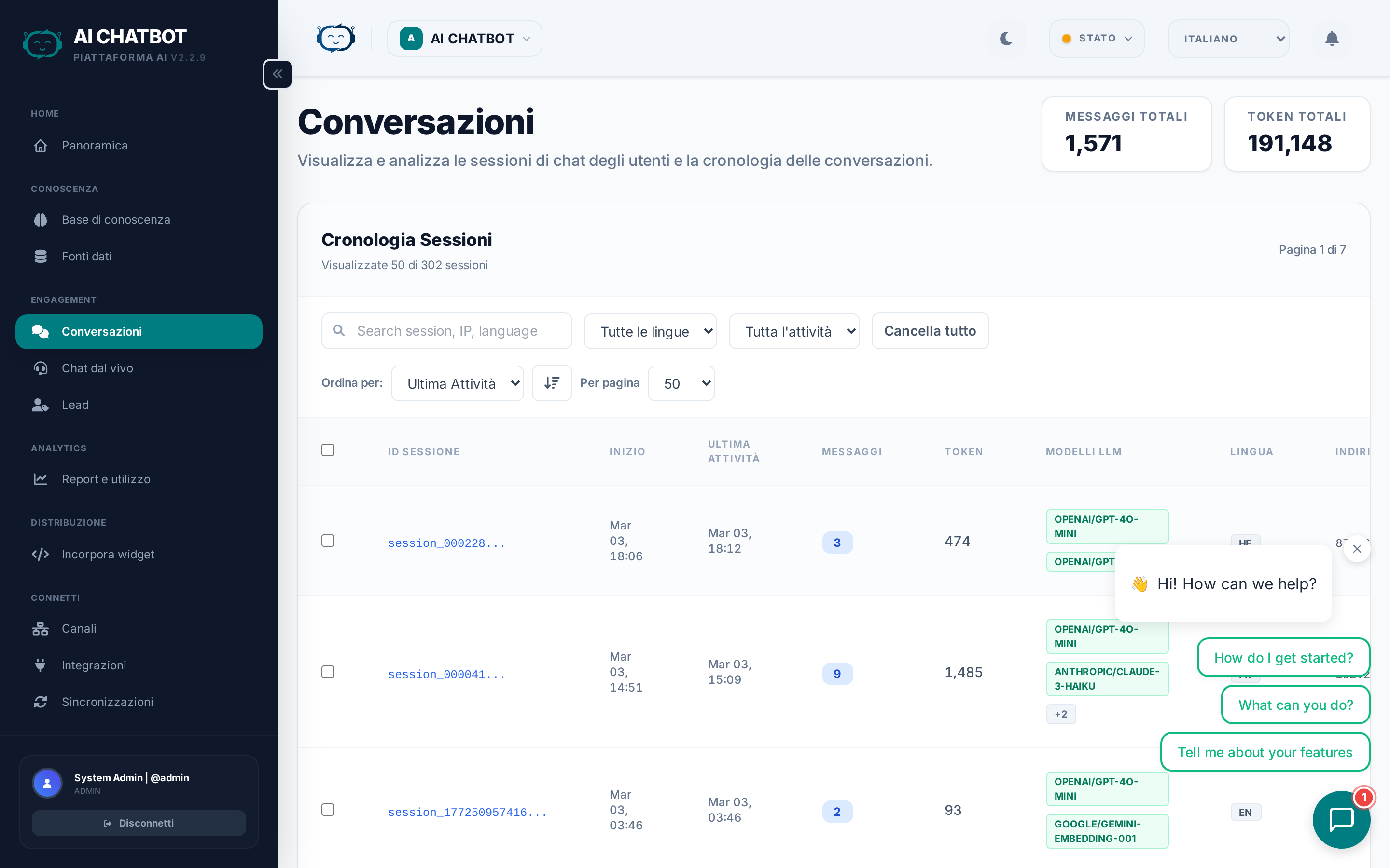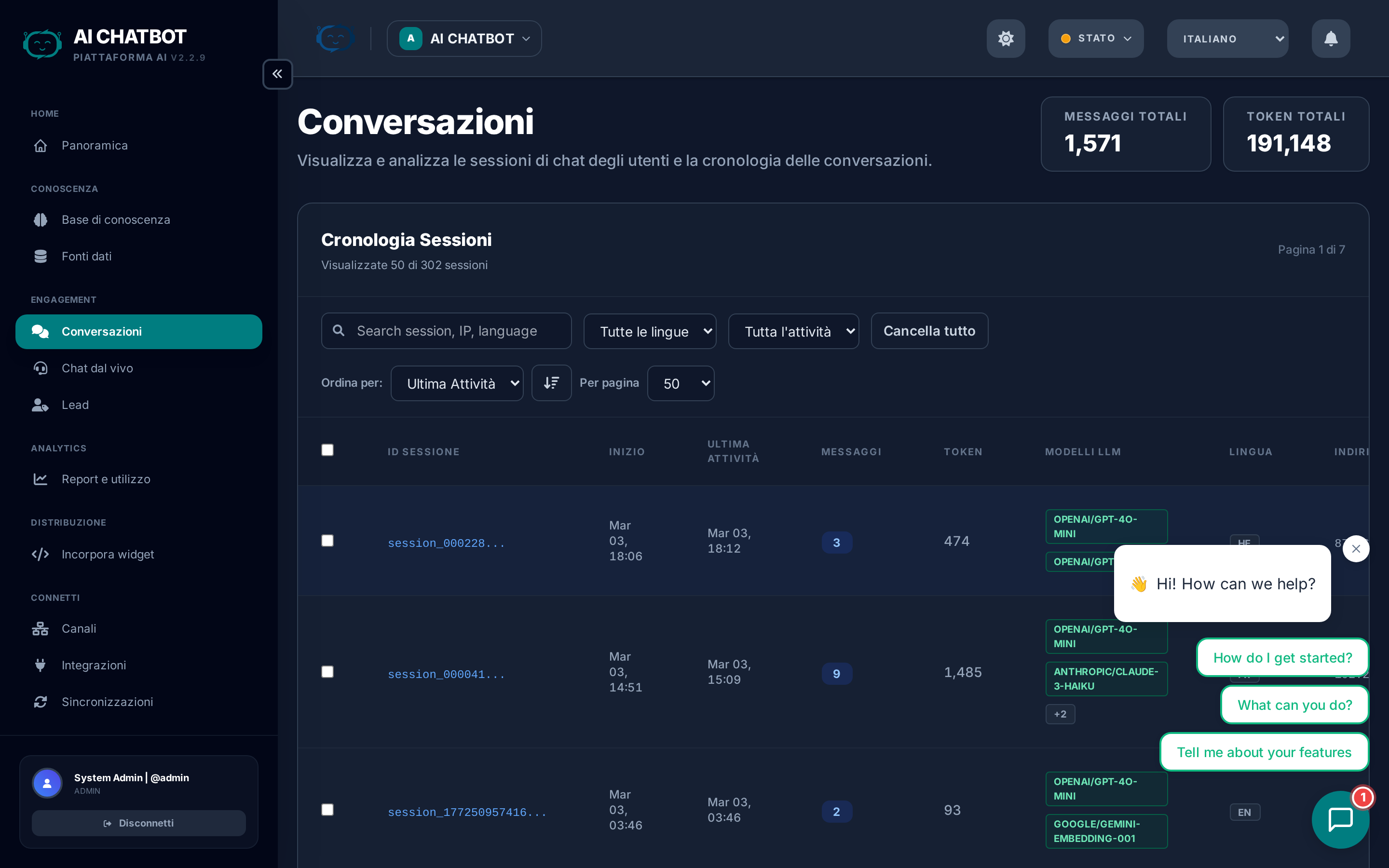 - Ogni badge indica un modello IA utilizzato durante quella sessione. Se appaiono più modelli, significa che la sessione ha utilizzato modelli diversi per compiti diversi (es. uno per la chat, un altro per gli embeddings).