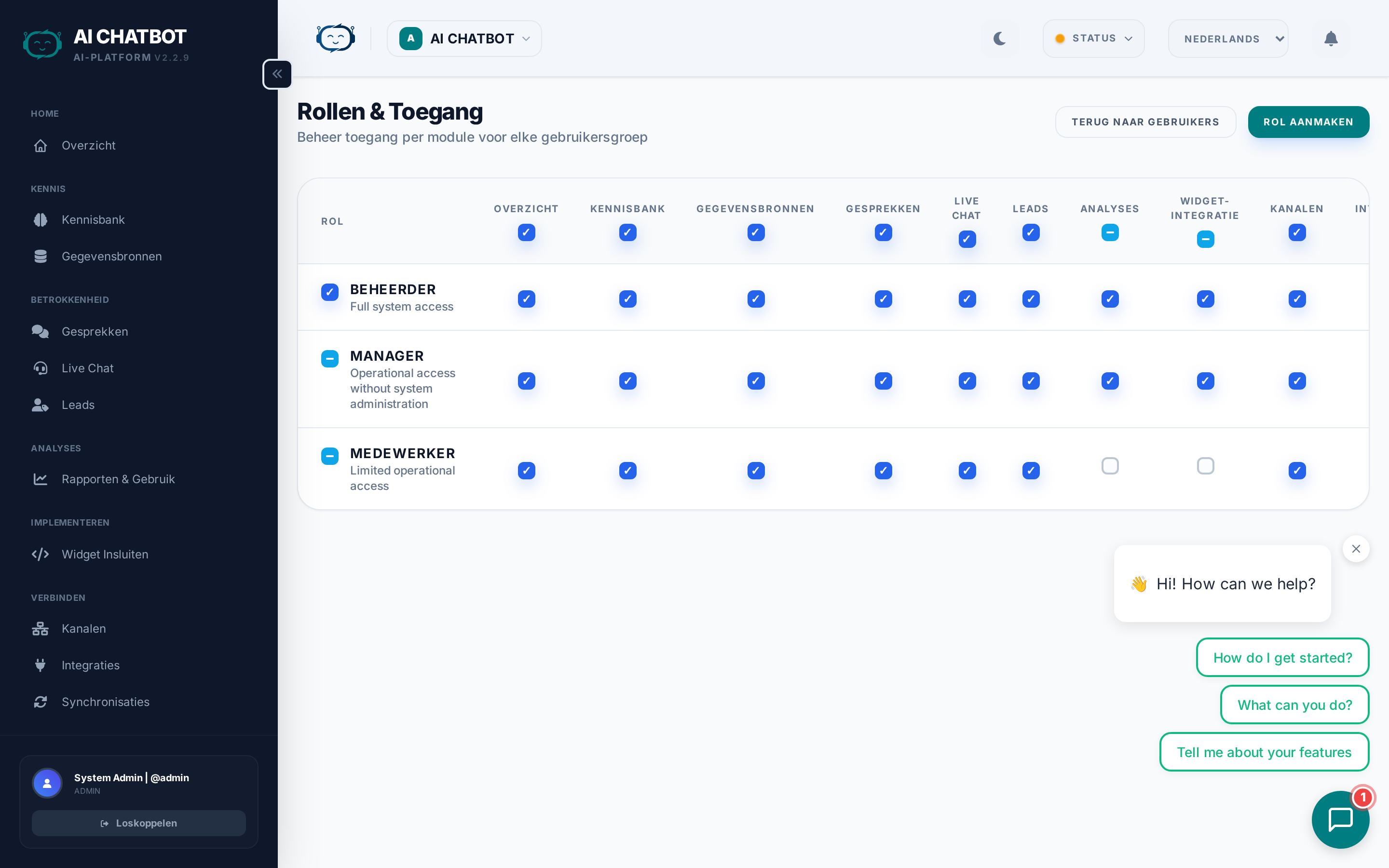 | Supportmedewerker | Staff | Behandelt gesprekken, leads en kennisbank zonder toegang tot instellingen |
