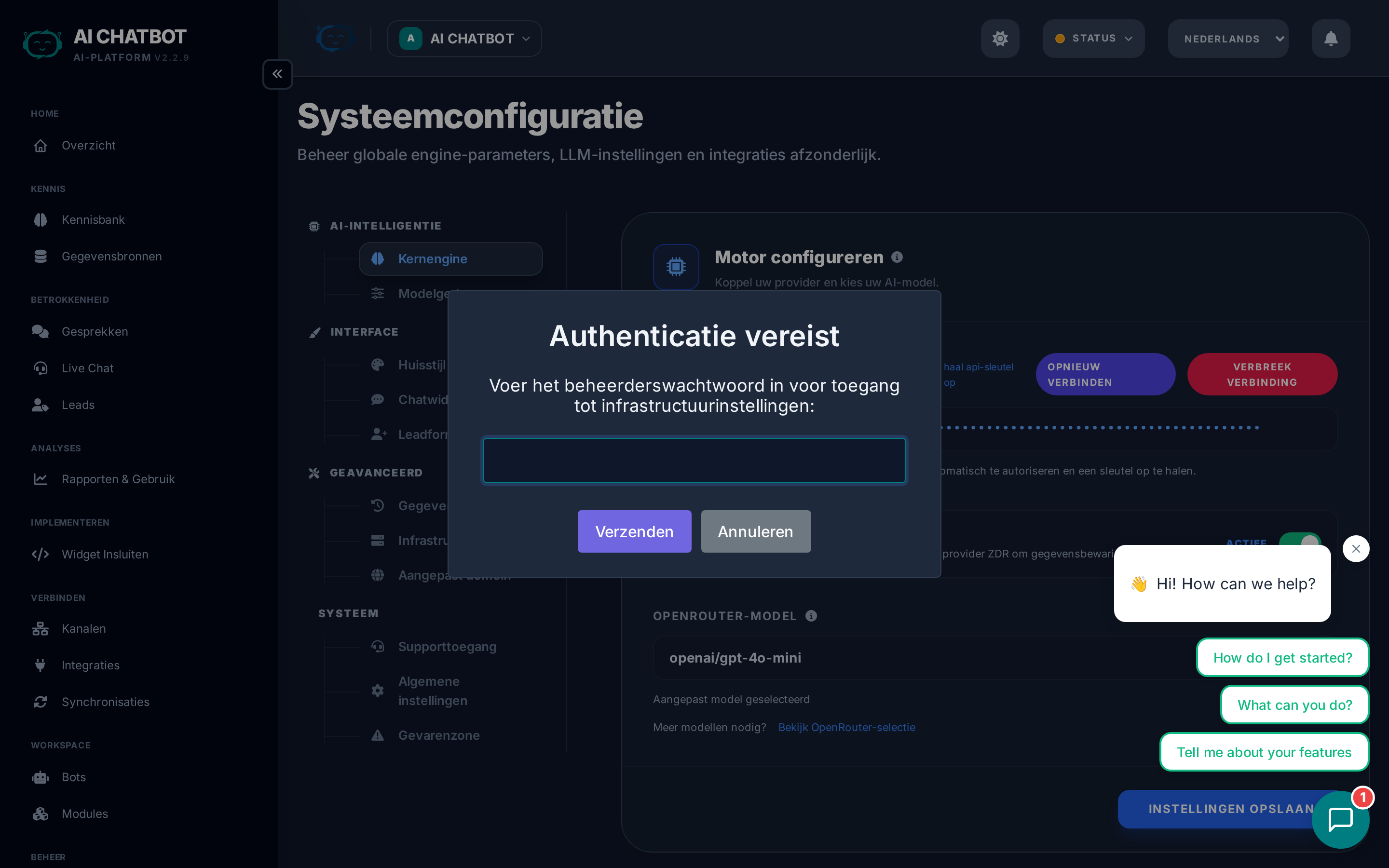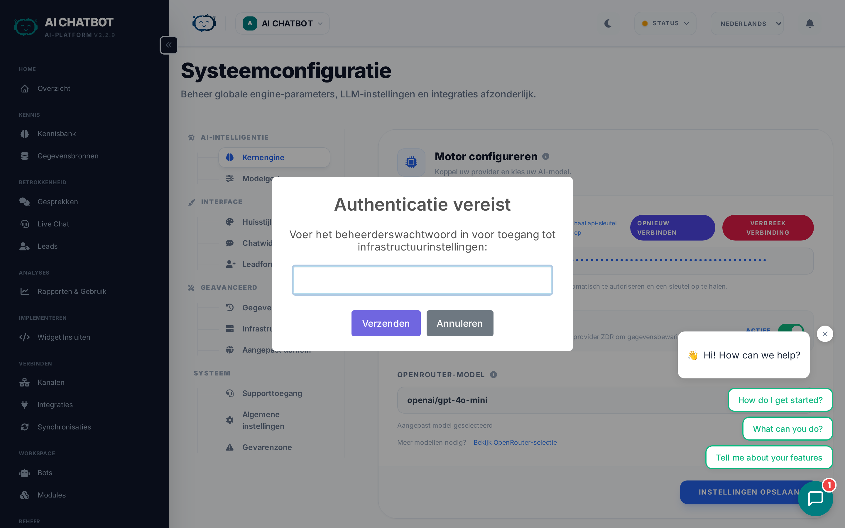 Configureer je AI-provider en de selectie van modellen. Dit is het eerste dat moet worden ingesteld — zonder AI-provider kan de bot geen antwoorden genereren.