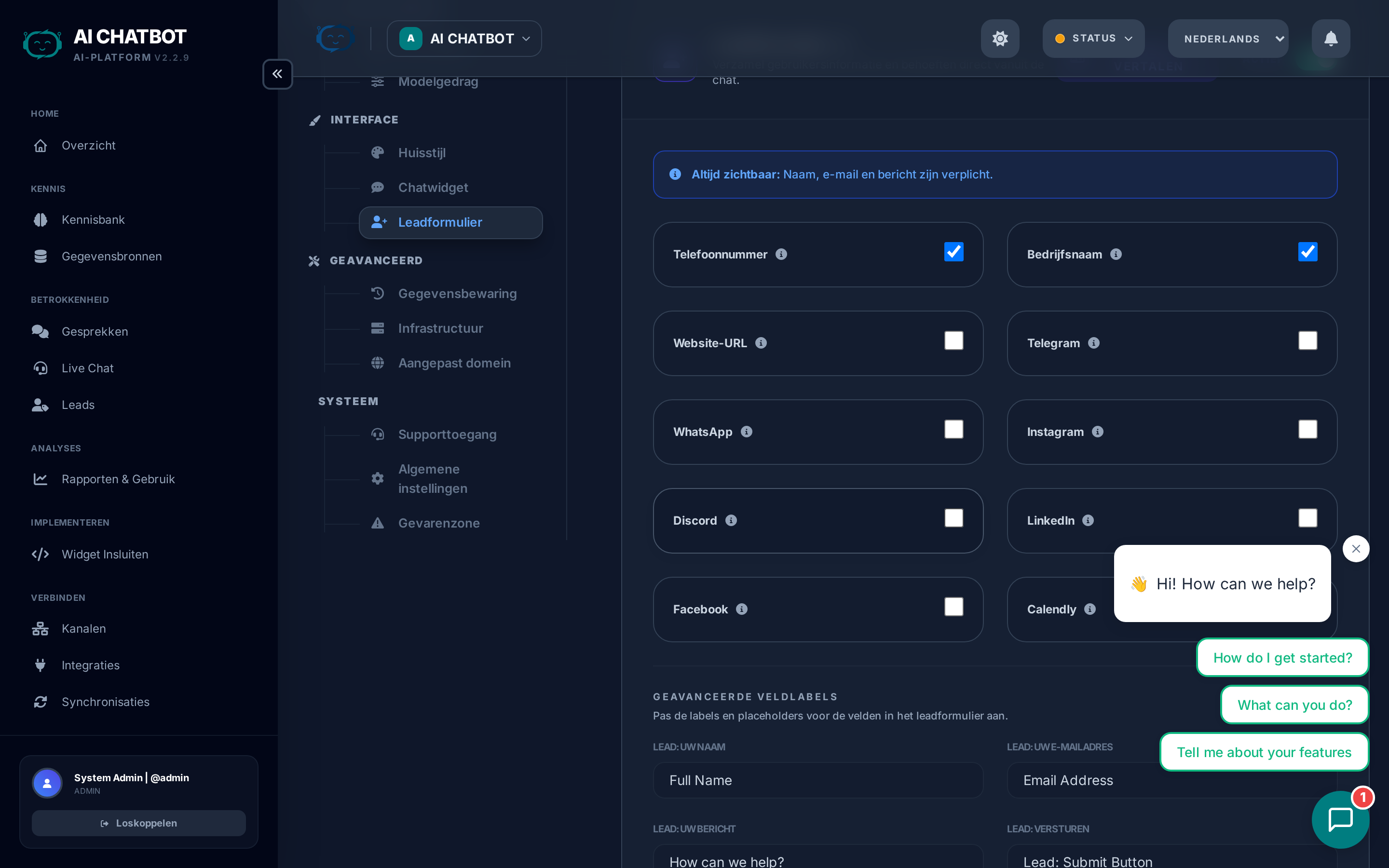 Bepaal welke velden worden verzameld wanneer een lead wordt vastgelegd in de chat. Het leadformulier verschijnt in de widget wanneer dit wordt getriggerd door intentie-detectie of configuratieregels.