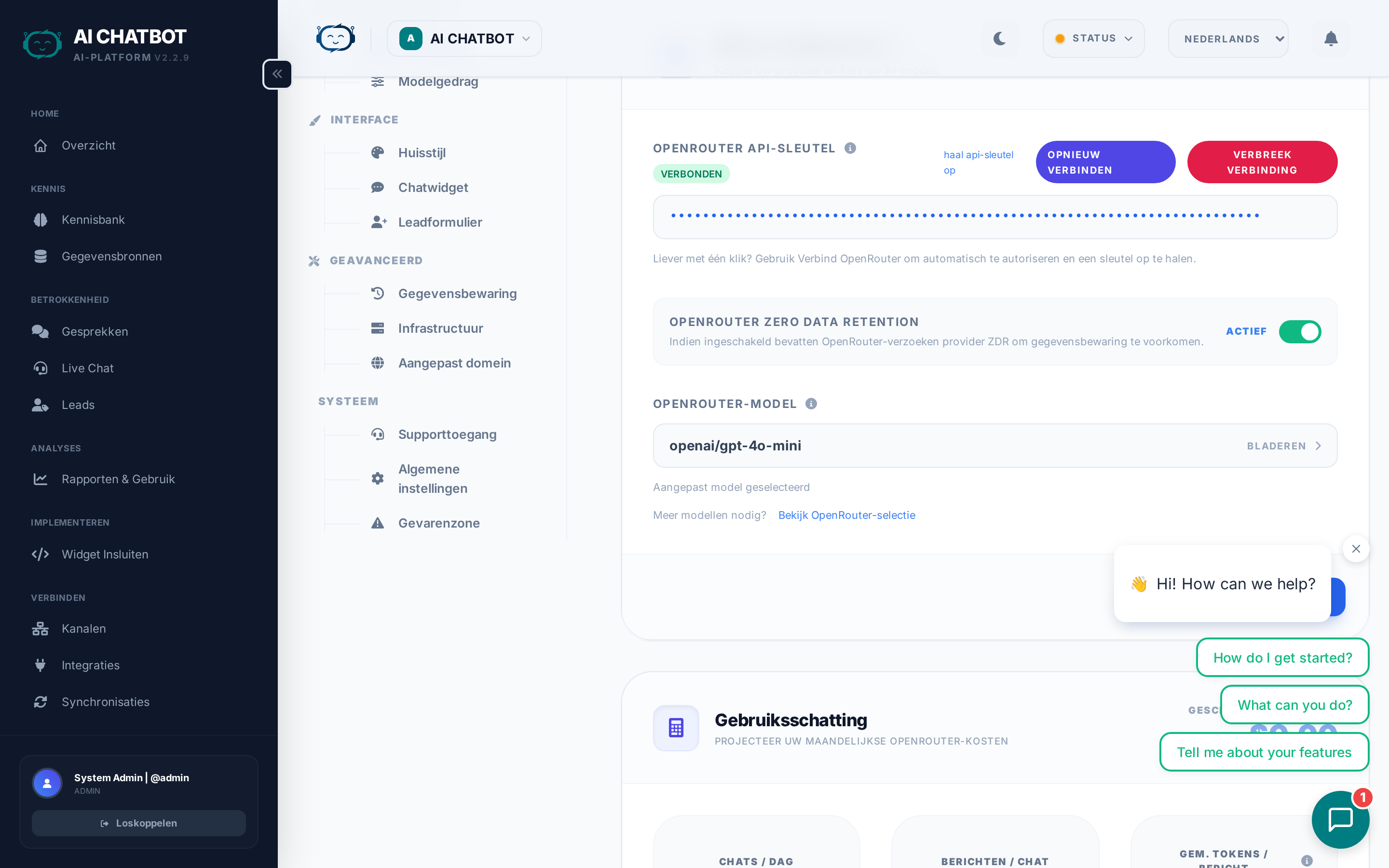 | Model Selector | Kies welk AI-model de gesprekken afhandelt | Elke optie toont de provider, contextvenster en prijsklasse |