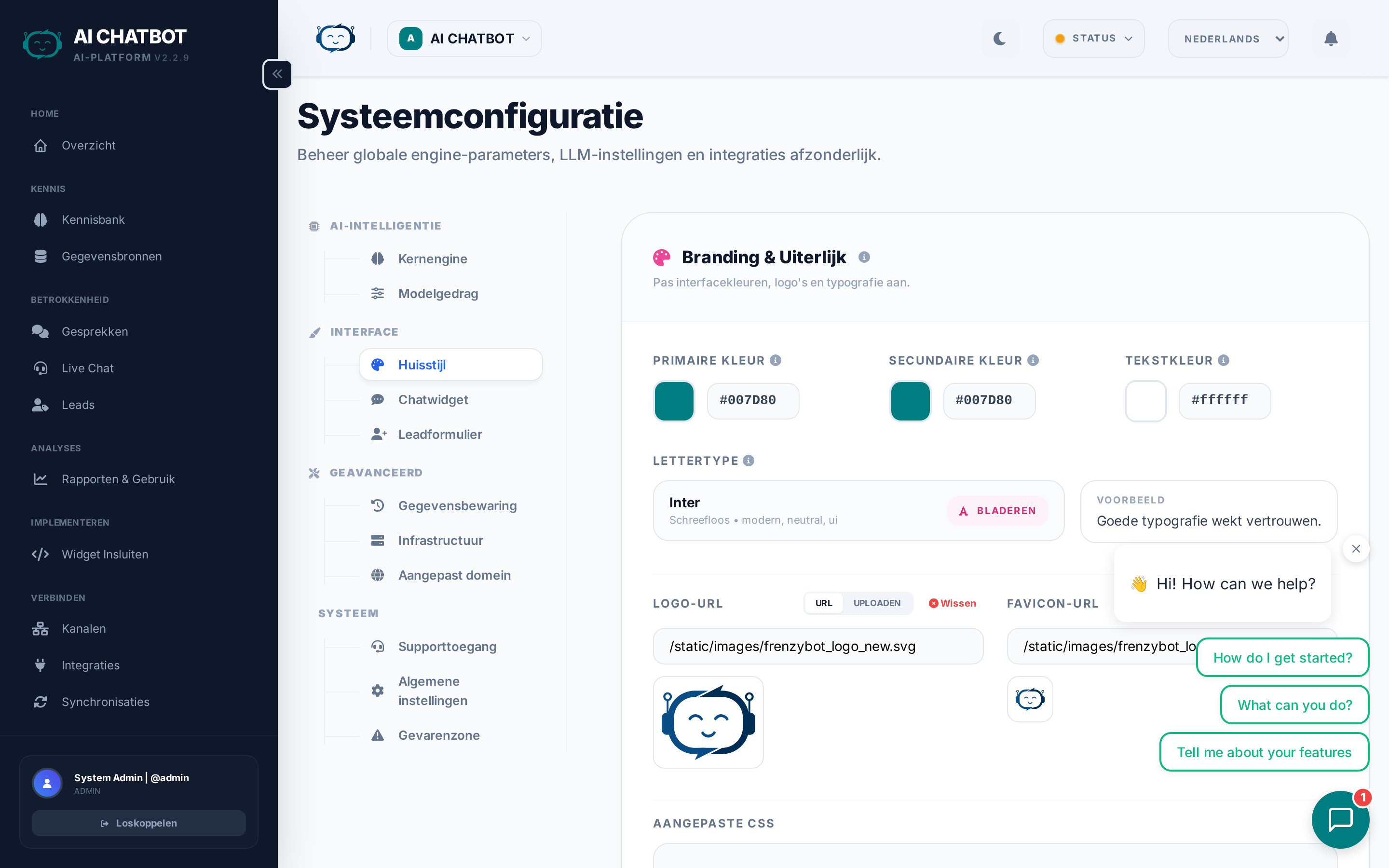 Verfijn elk aspect van je FRENZY.BOT-instantie — AI-gedrag, branding, widget-configuratie, lead-vastlegging en systeembeheer. Elk tabblad beheert een ander deel van het systeem.