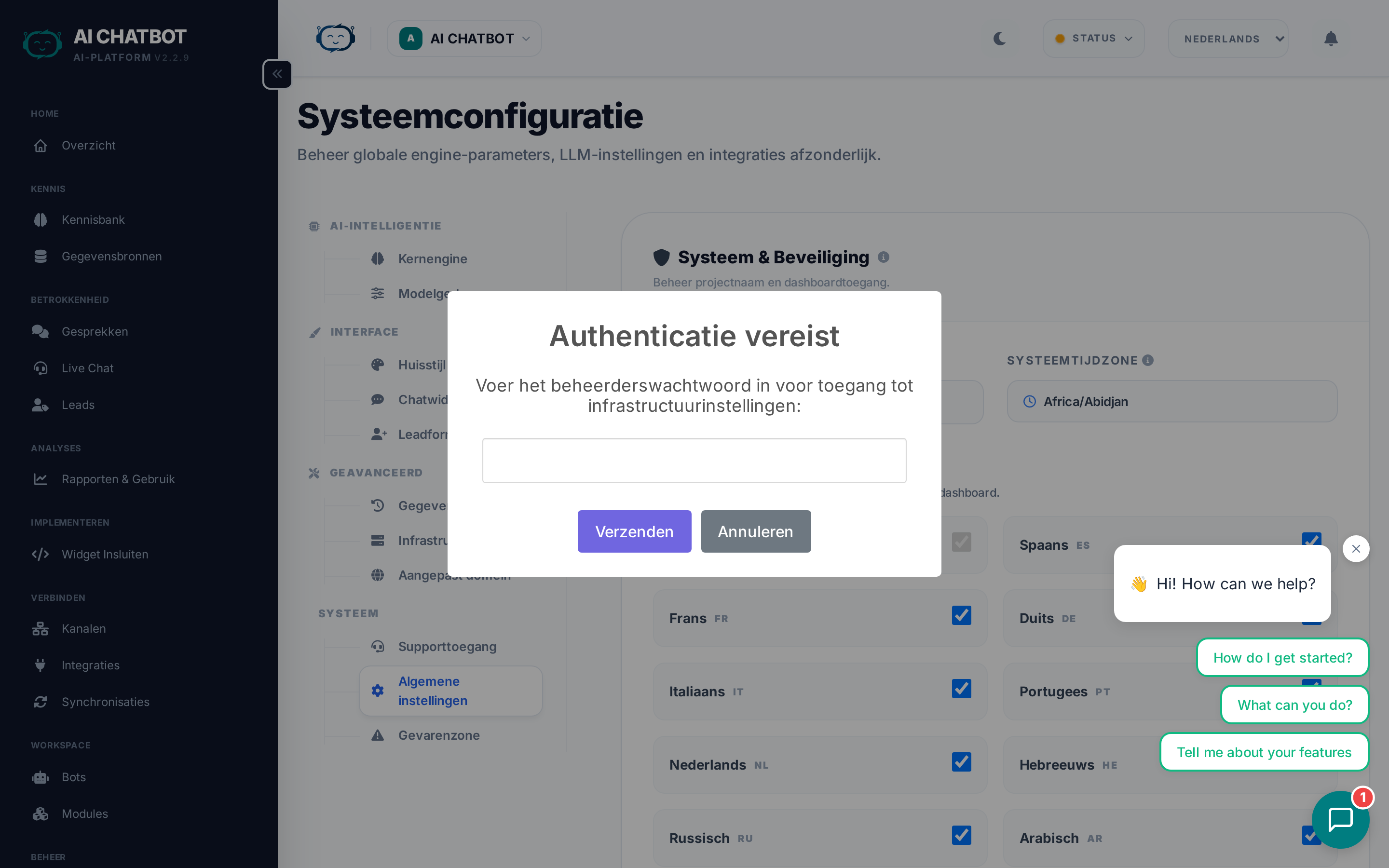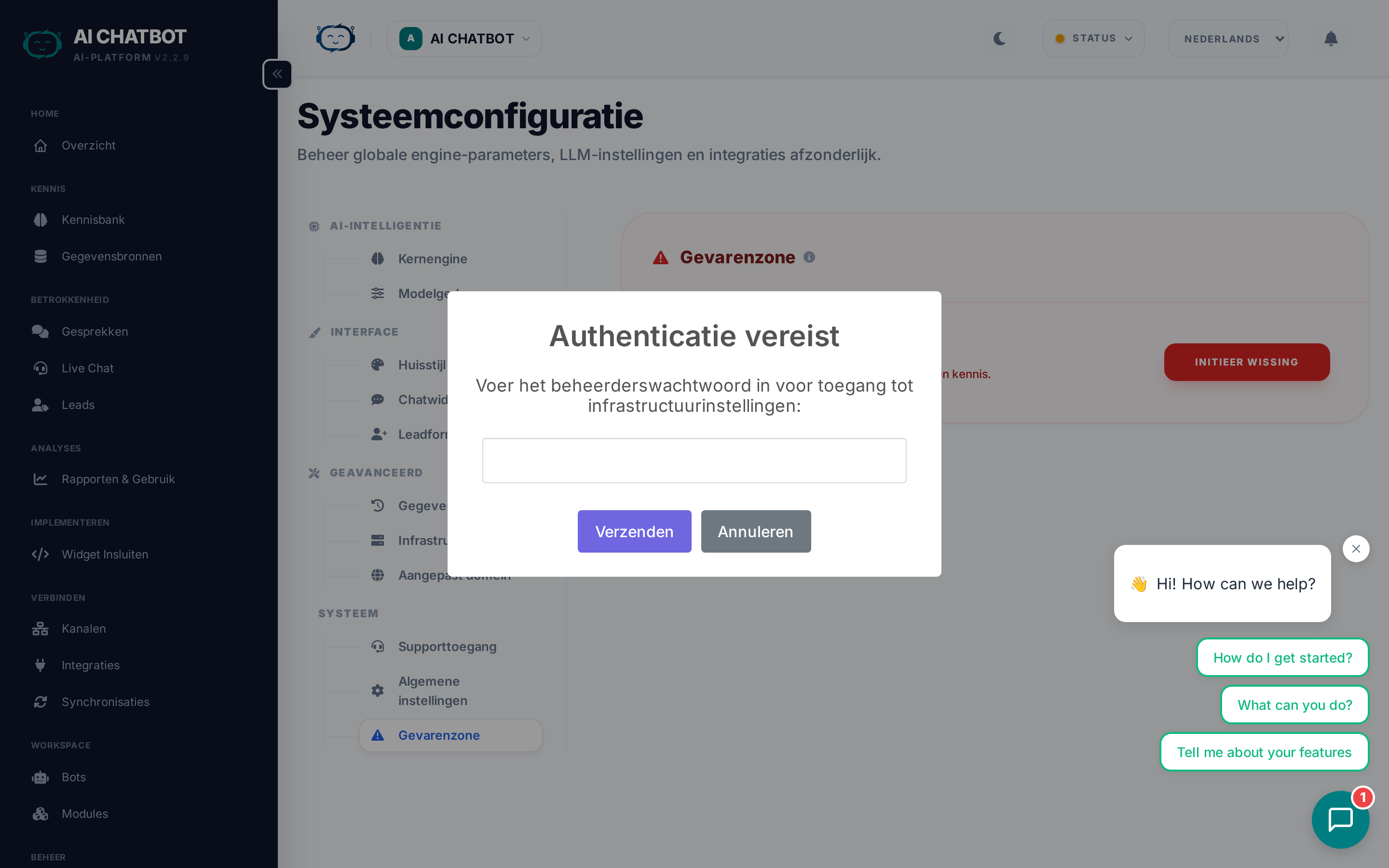 | Export Data | Downloadt een back-up van de gegevens van de huidige bot (kennisbank, gesprekken, leads) | Alles — dit is alleen-lezen |