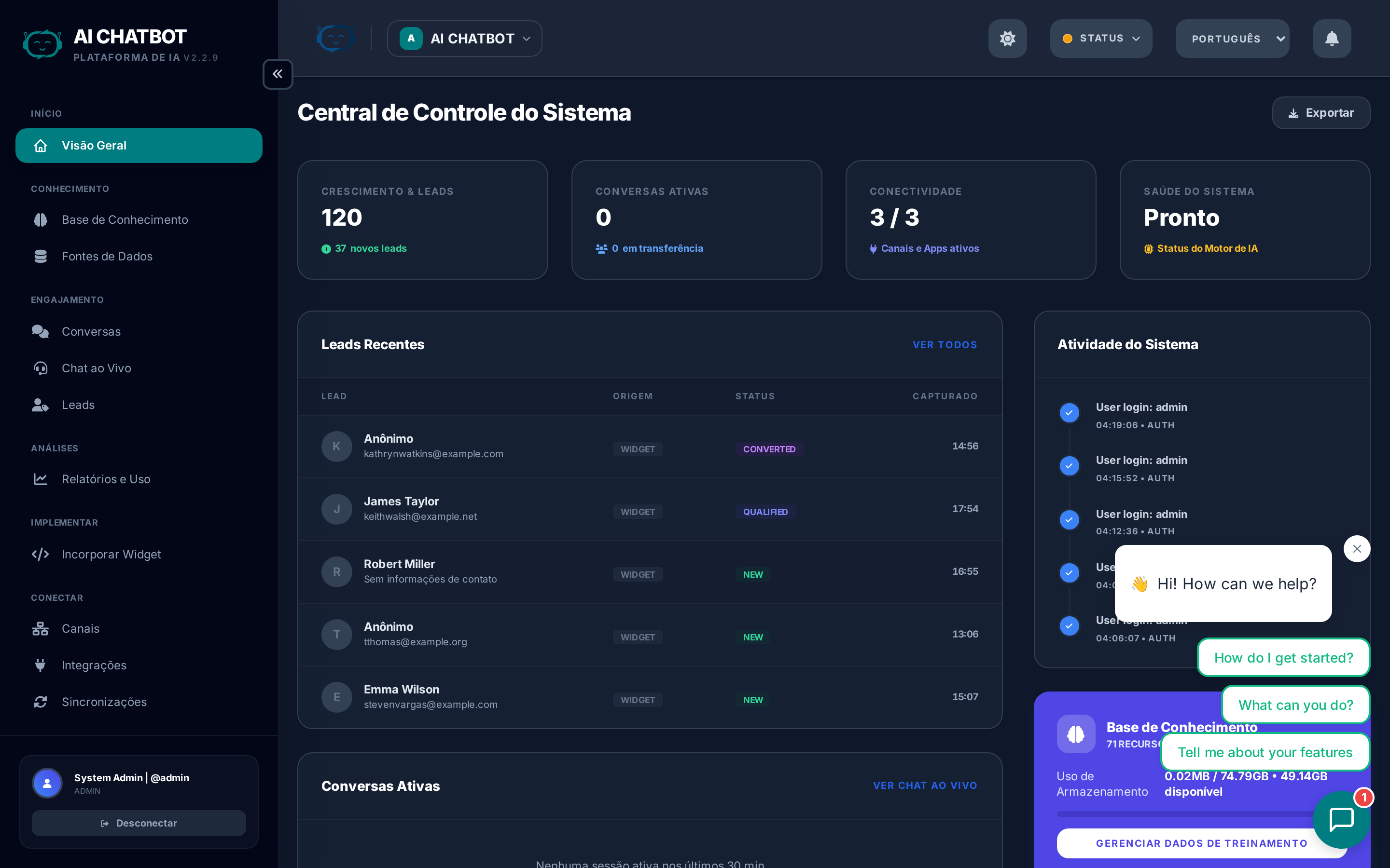- Se as sessões forem altas, mas os leads baixos, revise as configurações do seu formulário de leads e as mensagens de boas-vindas do widget.