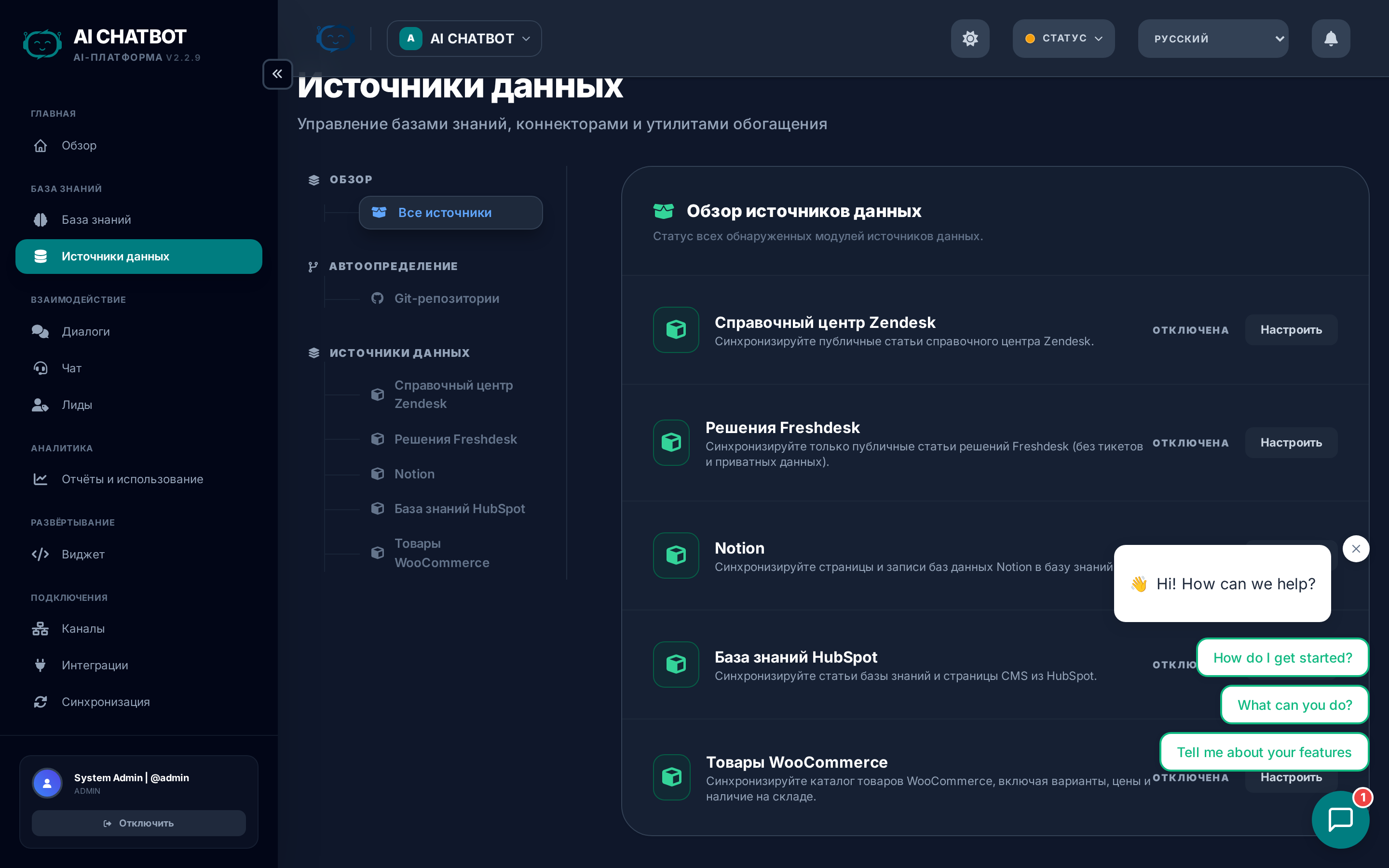 Страница «Источники данных» предоставляет обзор всех источников контента, питающих вашу базу знаний. Она показывает: