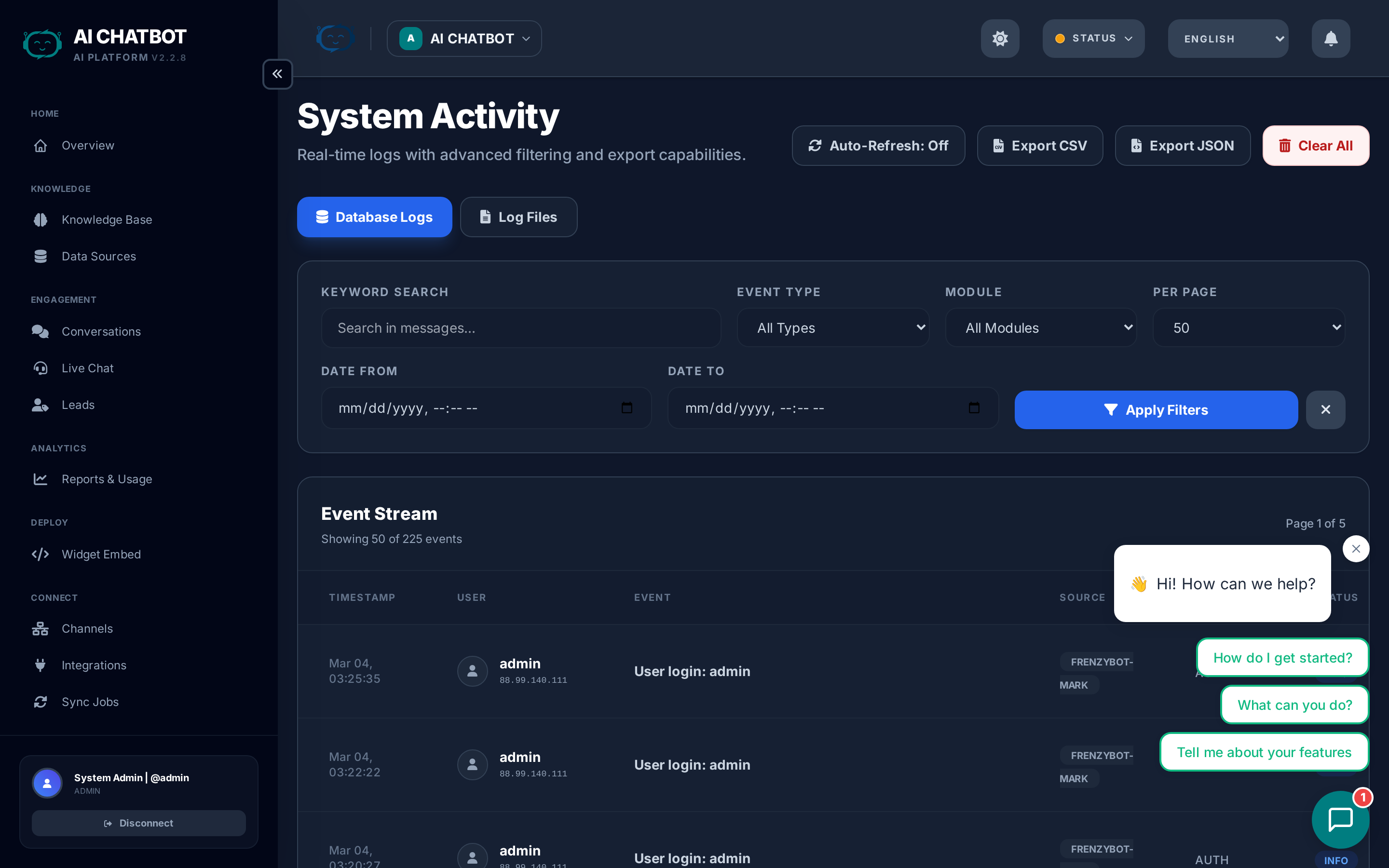 - Activity logs show actions within the current bot context. Global actions (user management, system-level settings) are visible to all admins regardless of which bot is selected.