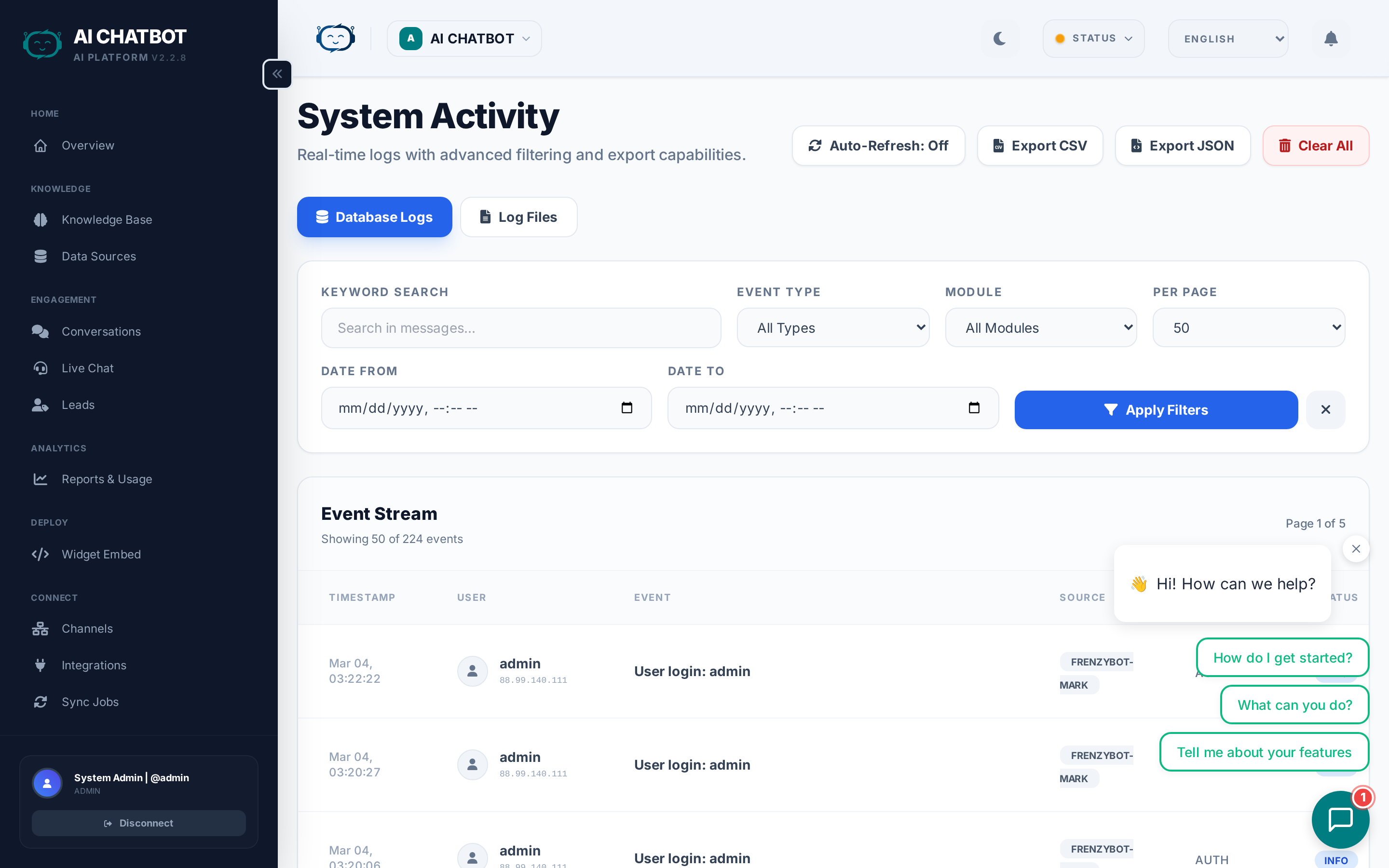 See who changed critical settings: - AI model or system prompt modifications - OpenRouter API key rotations - Branding or widget configuration changes - User role or permission updates